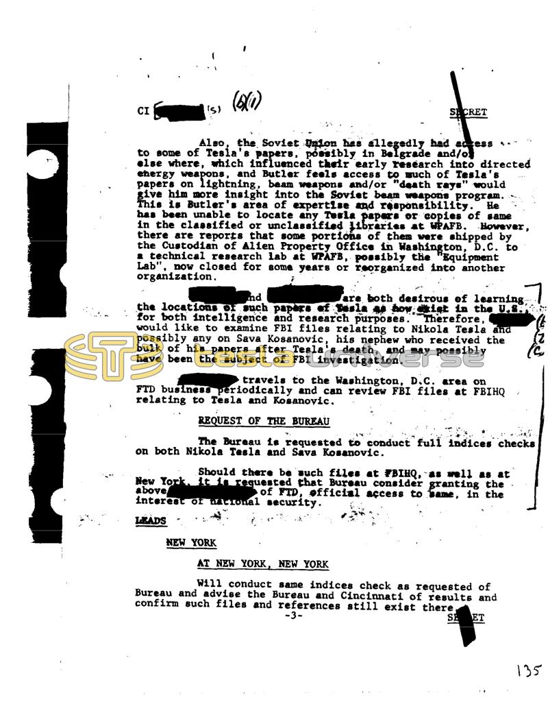 CI (S) (6)X(1) SECRET He Also, the Soviet Union has allegedly had access to some of Tesla's papers, possibly in Belgrade and/o]] else where, which influenced their early research into directed energy weapons, and Butler feels access to much of Tesla's papers on lightning, beam weapons and/or "death rays" would give him more insight into the Soviet beam weapons program. This is Butler's area of expertise and responsibility. has been unable to locate any Tesla papers or copies of same in the classified or unclassified libraries at WPAFB. However, there are reports that some portions of them were shipped by the Custodian of Alien Property Office in Washington, D.C. to a technical research lab at WPAFB, possibly the "Equipment Lab", now closed for some years or reorganized into another organization. 7 nd are both desirous of learning, the locations of such papers of Sesla ga how ckist in the U.SH for both intelligence and research purposes. Therefore, would like to examine FBI files relating to Nikola Tesla and possibly any on Sava Kosanovic, his nephew who received the bulk of his papers after Tesla's death, and may possibly have been the subject of FBI investigation. travels to the Washington, D.C. area on FTD business periodically and can review FBI files at FBIHQ relating to Tesla and Kosanovic. REQUEST OF THE BUREAU The Bureau is requested to conduct full indices checks on both Nikola Tesla and Sava Kosanovic. NEW YORK Should there be such files at FBIHQ, `as well as at New York. It is requested that Bureau consider granting the above of FTD, official access to same, in the interest of uitional security. LEADS AT NEW YORK, NEW YORK Will conduct same indices check as requested of Bureau and advise the Bureau and Cincinnati of results and confirm such files and references still exist there, -3SE ET 135