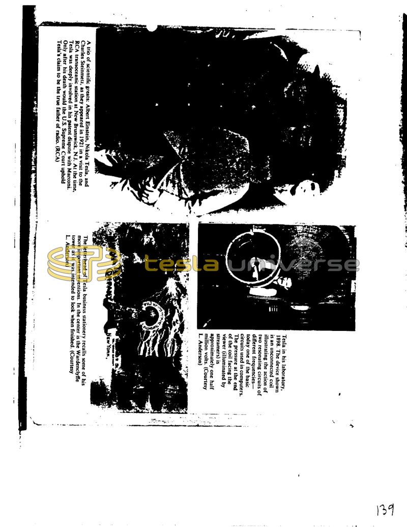 A trio of scientific greats: Albert Einstein, Nikola Tesla, and Charles Steinmetz, as they appeared in 1921 in a visit to the RCA transoceanic station at New Brunswick, N.J. At the time, Tesla was deeply involved in his patent dispute with Marconi. Only after his death would the U.S. Supreme Court uphold Tesla's claim to be the true father of radio. (RCA) PRO Tesla in his laboratory, 1898. The device shown is an unconnected coil illustrating the action of two resonating circuits of different frequencies today one of the basic circuits used in computers. The pressure at the end of the coil facing the viewer (illuminated by streamers) is approximately one half million volts. (Courtesy L. Anderson) '2000 BATANT NEW YORK, The letterhead of Tesla business stationery recalls some of his more important inventions. In the center is the Wardenclyffe tower as it was intended to look when finished. (Courtesy L. Anderson) 139