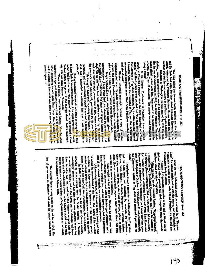 ļ DEATH AND TRANSFIGURATION - 262 The King added that he was deeply touched and that both he and Dr. Tesla had wept. He then visited Columbia University, to be warmly welcomed by President Nicholas Murray Butler and to find another link with his own country in the Pupin Physics Laboratory Returning to Washington, he was assured by FDR that food, clothing, arms, and ammunition would be dropped over Yugoslavia. But he was shocked when, In 1943, the British Mission In Yugoslavia made official contact with Tito. Peter asked to be parachuted into his country, but Churchill demurred Tito openly accused Mihailović of being a traitor.* At the Teheran Conference in November there occurred, largely at Churchill's Instance, what the King described as a "fatal change" of Allied policy It was decided that "the basic force fighting the Germans in Yugoslavia recognized by the Alles was the National Liberation Army, under the command of Tito, and the Partisan force received full recognition as an Allied Army Mihailović was thus denied and abandoned."* Winston Churchill overnight became a hero of modern Yugoslavia. And when the young monarch frantically wrote to FDR for support, the alling President replied urging him to accept Churchill's advice "as if it was my own." Within months Roosevelt died. Tesia's nephew Kosanović, along with certain other diplomatic representatives of King Peter, had been dismissed by the monarch at the height of the 1942 crisis He often told Bogdan Raditsa in those days that he lett Tesla had been terribly shocked by his nephew's exclusion from the royal government. In fact, Kosanović believed that the Inventor's death was actually precipitated by his own "setback." "He thought," Kosanović repeatedly told Raditsa, "that I was punished, and that eventually I would be arrested or something of the kind, but I succeeded to convince him that it was inevitable in politics." During this period Kosanović was frank in saying that he tried to keep Tesla from seeing members of the royal government. Ambassador Fotić had become "the enemy" since he still favored a Great Serbian policy as opposed to the changes ahead. Tesla's relationship with this old friend became "lukewarm." "There is no doubt," says Professor Raditsa, "that the whole internecine tragedy of Yugoslavia from 1941 to 1943 must have had a rather depressing impact upon Tesla. Very often he would ask me, could I explain to him what was going on among us, and why we cannot agree.... DEATH AND TRANSFIGURATION →→→ 263 After the war, Mihailović would be executed by a "People's Court" for alleged collaboration with the enemy, and the Republic of Yugoslavia declared to exist, with Tito as President for life and the Communists firmly in charge. A count of Yugoslavian casualties at the end of World War II disclosed that 2 million persons had died; tragically, many thousands had been killed by fellow Yugoslavs. "After the war." recalls Professor Raditsa, "Kosanović, bacama a minister in the Tito-Šubašić. Government, and I was tais nesistant in the Ministry of Information from 1944 to 1945, when I left the country, for I couldn't become a Communist. Later on in 1946, Sava Kosanović became Tito's ambassador in Washington but I never saw him again after I left Belgrade in October of 1945. Kosanović had accepted totally the Communist system in Yugoslavia and remained loyal until his death." There had not been a time in ten centuries when the Yugoslavs had not been ruled and ransacked by invaders by Venetians, Romans, Turks, Bulgars, Austrians, Hungarians, Germans, Italians, when they were not living under threat of tortum, prison, or violent death. Now a marvelous truth began to dawn upon them: that they were free, in a manner of speaking. Tesla would not live to see this. Whether he could ever have accepted the new government, with its Soviet-type Constitution and a Soviet alliance, whether he could ever have accepted the permanent exdle of his beloved monarch, are unanswerable questions. Unfortunately, however, all this was to have a bearing on how he would be remembered in the West. The fading of his scientific reputation, the forgetfulness of Americans in the postwar period, resulted in large degree from the disappearance of most of his scientific papers behind that new Cold War phenomenon, the Iron Curtain. In 1948 Yugoslavia ceased to be an Iron Curtain country, declaring its independence from the Soviet doctrine of "limited sovereignty" America and her allies then were generous in sending economic and military aid to the Slavs; but the damage had been done. America had not raced to Tito's wartime support with the alacrity that Churchill had shown. In the future it would not be made easy for American scholars to draw on Yugoslav sources to document the achievements of Nikola Tesla. The inventor became very feeble in the winter of 1942. His lear of germs was so obsessive that even his closest friends were 143