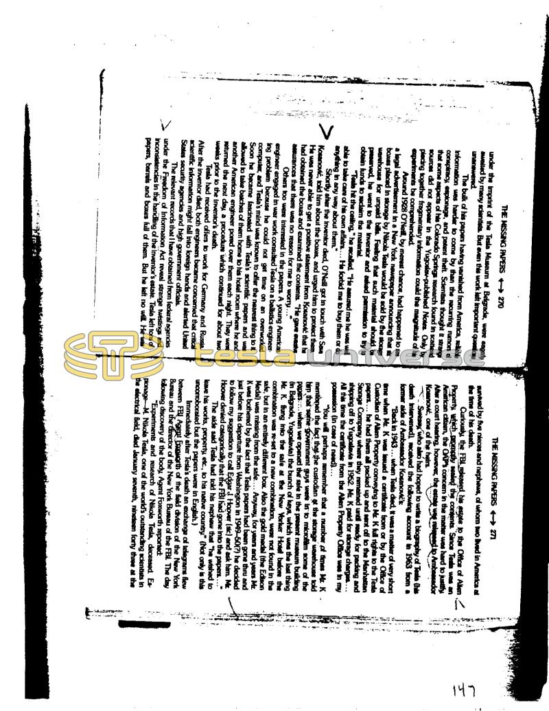 THE MISSING PAPERS →→→→ 270 under the imprint of the Tesla Museum at Belgrade, were eagerly awaited by many scientists. But even this work left important questions unanswered. The bulk of his papers having vanished from America, reliable Information was harder to come by than the recurring rumors of conspiracy, espionage, and patent theft. Scientists thought it strange that some aspects of his Colorado Springs research found in scattend sources did not appear in the Yugoslav-published Notes. Only by placing together fragmentary information could the magnitude of his experiments be comprehended. Around 1928 O'Neill, by merest chance, had happened to see a legal advertisement in a New York newspaper announcing that six boxes placed in storage by Nikola Tesla would be sold by the storage warehouse for unpaid bills. Feeling that such material should be preserved, he went to the Inventor and asked permission to try to obtain funds to reclaim the material. "Tesla hit the ceiling," he recalled. "He assured me he was wall able to take care of his own affairs.... He forbid me to buy them or do anything in any way about them." Shortly after the inventor died, O'Neill got in touch with Sava Kosanović, told him about the boxes, and urged him to protect them. He was never able to get a positive statement from Kosanović that he had obtained the boxes and examined the contents. "He gave evesive assurances that there was no reason for me to worry..." Others too were interested in the papers. A young American engineer engaged in war work consulted Tesla on a ballistics engineering problem because he could not get time on an overworked computer, and Tesla's mind was known to offer the nearest thing to it Soon he became fascinated with Tesla's scientific papers and was allowed to take batches of them home to his hotel room where he and another American engineer pored over them each night. They were returned the next day, a procedure which continued for about two weeks prior to the Inventor's death. Tesla had received offers to work for Germany and Russia. After the inventor died, both engineers became concerned that critical scientific information might fall into foreign hands and alerted United States security agencies and high government officials. The relevant records that I have obtained from federal agencies under the Freedom of Information Act reveal strange twistings and inconsistencies in the handling of the Inventor's estate. Tesla left tons of papers, barrels and boxes full of them. But he left no will. He was THE MISSING PAPERS →→→→ 271 survived by five nieces and nephews, of whom two lived in America at the time of his death. Curiously, the FBI released his estate to the Office of Allen Property, which promptly sealed the contents. Since Tesla was an American citizen, the OAP's concem in the matter was hard to justify After a court hearing, however, the estate was relapsed to Ambassador Kosanović, one of the heirs. Swenay, who also had hoped to write a biography of Tesla (his death intervened), received the following account in 1963 from a former side of Ambassador Kosanović's: "Back in 1943... when Tesla died, it was a matter of very short time when Mr. K was issued a certificate from or by the Office of Custodian of Alien Property conveying to Mr. K full rights to the Tesla papers.... he had them all packed up and sent off to the Manhattan Storage Company where they remained until ready for packing and shipping off to Yugoslavia in 1952. Mr. K paid for storage charges.... All this time the certificate from the Allen Property Office was in my possession (in case of need).... "You will perhaps remember that a number of times Mr. K. mentioned the fact that the custodian at the storage warehouse told him that some goverment guys were in to microfilm some of the papers when we opened the safe in the present museum building (in Belgrade, Yugoslavia) the bunch of keys, which was the last thing Mr. K. flung into the safe at the New Yorker Hotel before the combination was re-set to a new combination, were not found in the safe, but in an entirely different box. Also the gold medal (the Edison Medal) was missing from the safe.... Anyway, for years and years Mr. K was bothered by the fact that Tesla papers had been gone thru and just before his departure from Washington in 1949-50(?) he decided to follow my suggestion to call Edgar & Hoover (sic) and ask him. Me Hoover denied categorically that the FBI had gone into the papers.….. The aide said Tesla had told his nephew that "he wished to leave his works, property, etc., to his native country" (Not only is this uncorroborated but the papers were in English.) Immediately after Tesla's death an exchange of telegrams flew between FBI Agent Ennworth of the field division of the New York Bureau and the director of the New York Bureau of the FBI. The day following discovery of the body, Agent Foxworth reported: "Experiments and research of Nikola Tesla, deceased. Espionage M. Nikola Tesla, one of the world's outstanding scientists in the electrical field, died January seventh, nineteen forty three at the Pada tang .. 2. 147