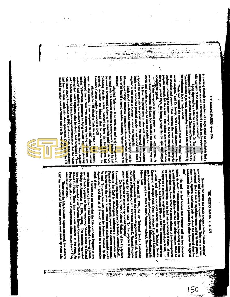 1. THE MISSING PAPERS ← 276 in creating through the medium of a high-speed jet of suitable fluid a vacuous space around a terminal of a circult and supplying the samy with currents of the required tension and volume."" Long afterward in a letter to a colleague, Dr. Trump told what happened when he visited the Hotel Governor Clinton to examine the "device"-eföred in its vault, presumably the same box remembered by the messenger boy in Tesla's room. "Tesla had wamed the management that this ‘device' was a secret weapon," said Dr. Trump, "and it would detonate if opened by an unauthorized person. Upon opening the vault and indicating the package containing the secret weapon, the hotel manager and enployees promptly left the scene." The federal agents who had come along pleo pulled back, the better to głye him the sole distinction of opening the parcel It was wrapped in brown paper and tied with a string te remembered hesitating, thinking how beautiful the weather was out doors, and pondering on why he was not outside too. He lifted the parcal onto a table and, mustering his courage, snipped the string with his pocket knife. He removed the wrapping Inside was a handsome polished wooden chest bound with brass. It required a final effort of courage to raise the hinged tid. Inside stood a multidecade resistance box of the type used for Wheatstone bridge resistance measurements a common standard Hem to be found in every electrical laboratory before the turn of the century! Why had Tesla seen fit to terrify the staff and management o the hotel with this harmless object for so many years? Perhaps he had become so accustomed to having his hotel bills paid behind his back believing that the hotels, honored to have him living there, had routinely dismissed the billings), that he was insulted when the Governor Clinton brashly demanded its $400. Although the FBI closed its Tesla file in 1943, it didn't seem to want to stay closed. It was reopened in 1957 when an informant complained that a New York couple were issuing newsletters containing "Information pertaining to flying saucers and interplanetary matters and explotting the Inventor's name and fame. They allegedly claimed that Tesla's engineers, after his death, had completed a "Testa Set," a radio device for interplanetary communication, that the device had been placed in operation in 1950 and since then Tesla engineers had been in close touch with alien spaceships. Once again the FBI decided no action was warranted and the file was closed. THE MISSING PAPERS ← 277 Sweasy had never put much credence in the "secast weapon" rumors and had written to an inquisar: "Because Tesla was a recluse, and himself liked to talk in mystifying terms during his later years, i think many legends have been built up about the dozens of ideas he had evolved but which were not permitted by others to see the light of He said he had known the Inventor wall for two decades before his death: "Tesla's greatest genius flamed up during a doaen or so years just before and slightly after the turn of the century. What he did after that may have carried the germs of some of the developments we are witnessing today, but he had not carried any of them at least on paper or in any other tangible form-to the point of practicality ….." Perhaps, but between 1945 and 1947 an Interesting exchange of letters and cables occured among the Air Technical Service Command at Wright Field, Ohio, in whose Equipment Laboratory much top-secret research was being performed, Military Intelligence in Washington, and the Office of Allen Property subject, fles of the late Nikola Tesla On August 21, 1945, the Air Technical Service Command sequested permission from the commanding general of the U.S. Army Air Force in Washington, D.C., for Private Bloyce D. Fitzgerald to go to Washington for a period of seven days "for the purpose of securing property clearance on enemy impounded property" On September 5, 1945, Colonel Holliday of the Equipment Laboratory, Propulsion and Accessories Subdivision, wrote to Lloyd L. Shaulis of the OAP in Washington, confirming a conversation with Fitzgerald and asking for photostatic copies of the exhibits annotated by Trump from the estate of Tesla. It was stated that the material would he used "in connection with projects for National Defense by this department," and that all of it would be returned in a reasonable length of time. That was the last time that the Office of Allen Property or any other federal agency in the United States admitted to having possession of Tesla's papers on beam weaponry Shaulls wrote to Colonel Holliday on September 11, 1945, saying. "The materials requested have been forwarded to Air Technical Service Command in case of Lt. Robert E. Houle. These data are made available to the Army Air Force by this office for use in experiments, please return them." They were never returned. These were the full photostatic copies, not merely the abstracts. OAP has no record of hour many coples were made by those who 150