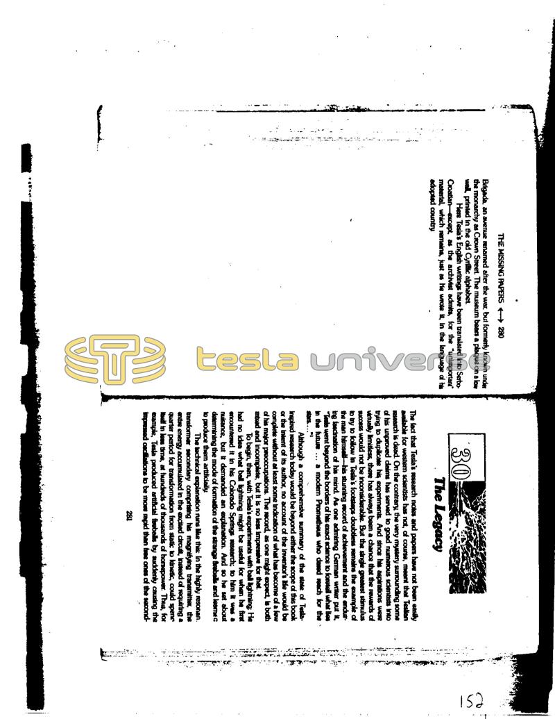 THE MISSING PAPERS >> 280 Brigada, an avenue renamed after the war, but formerly known under the monarchy as Crown Street. The museum bears a plaque on a low wall, printed in the old Cyrillic alphabet. Here Tesla's English writings have been translated into SerboCroatian-except, as the archivist admits, for the "unimportant" material, which remains, just as He wrote it, in the language of his adopted country •£5***] 30 The Legacy The fact that Tesla's research notes and papers have not been easily available for western scientists has not, of course, meant that Teslian research is dead. On the contrary, the very mystery surrounding some of his unproved claims has served to goad numerous scientists into trying to duplicate his experiments. And since his aspirations were virtually limitless, there has always been a chance that the rewards of success would not be inconsiderable. But the single greatest stimulus to try to follow in Tesla's footsteps doubtless remains the example of the man himself-his stunning record of achievement and the enduring fascination of his mind. As one admiring German writer put it, *Tesla went beyond the borders of his exact science to foretall what lies in the future ... a modem Prometheus who dased reach for the stars.... PL Although a comprehensive summary of the state of Teslainspired research today would be beyond either the scope of this book or the intent of Its author, no account of the inventor's life would be complete without at least some indication of what has become of a lew of his major preoccupations. The record, as one might expect, is both mixed and incomplete, but it is no less impressive for that. To begin, then, with Tesla's experiments with ball lightning: He had no idea what ball lightning might be useful for when he first encountered it in his Colorado Springs research; to him it was a nuisance, but it demanded an explanation. And so he set about determining the mode of formation of the strange fireballs and leamEG to produce them artificially The technical explanation runs like this: In the highly resonan. transformer secondary comprising his magnifying transmitter, the entire energy accumulated in the excited circuit, instead of requiring a quarter period for transformation from static to kinetic, could spene Itself in less time, at hundreds of thousands of horsepower. Thus, for example, Tesla produced artificial fireballs by suddenly causing the impressed oscillations to be more rapid than free ones of the second281 esi