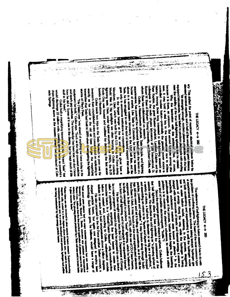 THE LEGACY - 282 ary. This shifted the point of maximum electrical pressure below the elevated terminal capacity, and a ball of fire would leap great distances Yet strangely enough, modem plasma physicists with the bestequipped laboratories, have failed to produce plasmoids with anything near the stability of the true ball-lightning spheres that he created. course, Why the fascination with this problem? First, because it is there, an unknown. But second because among other uses, It may hold a vital key in the international race to achieve controlled nuclear fusion-potentially the greatest power source in history Among those long interested in ball-lightning research are Peter Kapitza, the great Russian physicist, Lambert Dolphin and his colleagues in the radio physics laboratory at SRI International, Dr. Robert W. Bass of Brigham Young University, and Robert Golka, walih whom Bass has collaborated on research. Golka, a Massachusetts physicist, Tesla disciple, and lightning experimenter, has pursued the ephemeral fiseball with the fervor of a hunter of snarks. Like Tesla in Colorado, he has done his research alone in a remote westem laboratory in the Utah salt flats, and like Tesla, he has struggled to win the kind of federal support that usually goes only to enormous institutions or corporations. in the largest hangar at the far end of the ghost base at Wendover, Utah, which was built by the U.S. Army Air Force during World War II, big spotlights are often burning as Golka conducts Nightning tests. Here, under tightest security in the 1940's, the B-29 Enola Gay was housed and outfitted for delivering the first atomic bombs to Hiroshima. Golka' made two trips to the Tesla Museum to pore over the Inventor's then unpublished notes and concentrated on replicating as exactly as he could in the old air base hangar the magnifying transmitter that Tesla had built in 1899 when investigating the lightning storms of Pike's Pook. "He (Tesia) was 'way ahead of anything we have today in the equipment be built," Golka says. "Such as the high-powered switches and spark gap switches. The knowledge has been lost, we don't know how he did it. Some of it was in the diaries, but he kept much of this stuff in his head." Golka built a magnifying transmitter at his "Project Tesla" that would discharge 22 million volts, creating almost twice as powerful a chain-lightning storm as the maestro himself had produced at Colorado Springs THE LEGACY → 283 The relevance of ball lightning to fusion research has to do with the problem of confining plasma. The heart of the most common type of experimental fusion reaction involves taking isotopic hydrogen gas and both accelerating and superheating it until the hydrogen nuclei fuse to make hellum nuclei, releasing, in the process, staggering amounts of energy Along the way, while the hydrogen is baing. charged with vast amounts of kinetic and thermal energy, it enters an imperfectly understood material stats known as plasma." In the penultimate stages of the process, before fusion begins, the besetting problem is to maintain the plasma's coherence, to confine it within some kind of invisible electromagnetic "bottle."† 153 Since the strongest geometric shape is a sphere, Golka believes that ball lightning offers the best potential for containment of the unstable mass. He describes the odd lightning as "a glowing sphere of a variety of colors, a half-inch in diameter or as big as a grapefruit," and resembling an onion in its "layers and layers of alternate charged particles, positive and negative." It may bounce along through buildings, fall into water and set it boiling; and sometimes, as at the Hill Air Force Base in Utah, it may knock out the most sophisticated electronic equipment. In the summer of 1978, with the use of CO-2 laser beams, he finally managed to produce "bead" lightning, which he believes to be a form of ball lightning, and to photograph it in sequential frames.* He then sought support from the U.S. Department of Energy for a major program of research for which he proposed to use a device called a pyrosphere, employing five laser bears to create ther monuclear fusion. In a "Fireball Fusion Reactor" only nonradioactive helium is created and, according to Golka, mathematical models Indicate it can reach and hold temperatures above a billion degreas. He also proposed to the Air Force another Teskan concept, a charged particle beam, but again one designed to employ laser technology Such beam guns, he belleves, would have a range of "Unill recent years plasma had no major industrial importance but was reavaly a laboratory curiosity, Richard L. Barsin, executive vice president of International Phema Corp, believes that the first practical application of plasmas came in the 19th century when the glowing pleame produced by a Tesla coll was used to locate lanks glas vecum Basks." fiestan idees are also involved in other aspects of fusion research. Superconducting magnetic colls, cooled to a low degreus above absolute asso, are used in magnetic containment devices; and, in a newly developed rival process, hychogen ludi pal a being bombarded by high-energy particle beams.