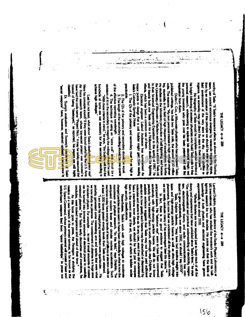 . I THE LEGACY →→→→ 288 worthy of Tesla: "If Tesla's resonance effects, as shown by the Stanford team, can control enormous energies by miniscule triggering signal, then by an extension of this principle we should be able to affect the field environment of the very stars in the sky...With godlike a rogance, we someday may yet direct the stars in their courses." ng No biography of Tesla would be complete without mention of his bright following of amateur physicists who build Tesla coils for their personal research, endeavoring to replicate his electrical magic; and the young Inventors who pore over his basic patents and still find Inspiration from them. Durlin C. Cox, a Wisconsin physicist who has pondered Teslah published writings, has built two Tesla colls, the second of 10 million volts. The reasons: "My own personal interest in high voltage engineer ing, especially in the field of high frequency rf transformers; to further my studies on the laboratory production of ball lightning; and because the University of Wisconsin at Madison asked me to submit a Tesla coll in their bl-annual Engineering Exposition in the spring of 1981." He and friends built one Tesla coil for a Hollywood studio for lightning affects, which has been a common use of them. Electrical engineer Leland Anderson has summarized the major points in design that a coll builder might gain from reading Tesla's Colorado Springs Notes: 1. The Q's of the primary and secondary must be as high as practicable. 2. The Q's of the primary and secondary should be equal 3. The length of the secondary winding should be one-quarter of the effective operating wavelength. 4. The technique of using an "extra coll" tank circult (or a variation of it) in the secondary to magnify the voltage should be used. "With these criteria in mind," he says, "the builder will find that hundreds of turns are not necessary for the secondary winding to achieve high voltages." Last but not least, what about Tesla's death/disintegrator rays? Were his concepts sound? If they were found useful by the U.S. Army Air Force research team, whose top-secret project was rumored to have had the code name "Project Nick," it may be safely assumed that Instead of being "destroyed," as reported, his papers are still highly classified. Dr. Trump's evaluation and Swezey's assessment of Tesla's "secret weapons" have, however, raceived updated concurrence by THE LEGACY →→ 289 Lambert Dolphin, assistant director of the Radio Physics Laboratory at SRI International, who has studied the inventor's work and his balllightning research for two decades. He points out that the fields of knowledge of both physics and electrical engineering have grown exponentially since about 1930. "Whole libraries are now required just to keep track of all the theory and experience that have unfolded since Tesla's time," he says. "Our mathematical and practical understanding of electricity, magnetism, electromagnetic theory, and radio communications has coninued to grow explosively ever since 1950, or should I say 1970!" Tesla, Dolphin believes, "may have had intuitive Insight into Insers and high-energy particle beams as well as ultra-high voltage phenomena, but now that we understand all the physics much more, we can easily evaluate many of his extravagant later-life claims."* In fact, there is no good evidence to suggest that Tesla anticipated lasers. His "teleforce rays" seem to have been concerned exclusively with high-energy particle beams. We still do not know precisely how he intended them to work, although, says Dolphin, the available evidence suggests that Tesla may not have paid sufficient attention to how greatly such beams may be absorbed or dispersed by molecules and atoms in the air. In any case, even if we did understand Teslas intentions more clearly, we should be hard put to compare them to the current state of the art, much of which is hidden under high security classifications. Nevertheless, Tesla's work with high voltages to accelerate charged particles does seem to have been decidedly in what is now the mainstream of physical research. "In this field," says Dolphin, "he anticipated modem linear and circular nuclear accelerators. Such machines today have energy levels of tens of billions of electron volts or at least 1,000 times greater energy levels than Tesla ever attained. "I am sure his magnifying transmitters were spectacular... He probably generated some interesting arcs and sparks that were what we now study as plasmas. The containment of plasmas is a huge area of modern physics. For example... to see if small amounts of matter can be turned into immense amounts of electrical power in carefully contained plasmas." But Tesla's early discoveries and inventions, he concludes, were indeed ingenious and ahead of their time." As this book goes to press, the Pentagon is studying the creation of a new branch of the armed services, to be known as the U.S. Space Command, whose primary arsenal will consist of laser and particle-beam weapons fired from space battleships." In prose not 156