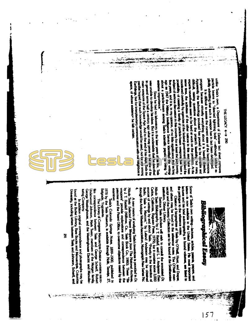 # 1: THE LEGACY →→ 290 unlike Tesla's own, a Department of Defense fact sheet compares particle beams to "directed lightning bolts" -although without explicitly admitting that such a weapon has in fact been developed. It is difficult to assess the current state of the beam-weapons program because virtually everything about it is heavily classified. Apparently the technology involved has proved to be complex and difficult, raising questions about the project's feasibilty, but many experts nevertheless seem to be hard at work on the problem. At the same time, the activities of the other nations in this area have been monitored carefully by agencies of the federal government. Indeed the possibility of creating a family of particle-beam weapons has been a subject of serious discussion in this country for at least the past twentyfive years, and it is, in my opinion, of no little significance that as long ago as 1947 the Military Intelligence Service Identified the writings about a particle-beam among Tesla's scientific papers as being "of extreme importance." Since he had no laboratory in the later years of his life, Tesla was unable to develop his ideas. But it is undeniable that he described In general terms half a century ago what may prove to be one of the main weapons of the Space Age. And to the end of his days, Tesla the pacifist hoped that such knowledge would be used, not for war among Earthlings, but for interplanetary communication with our neighbors in space, of whose existence he felt certain. Bibliographical Essay Some of Tesla's own writing-lectures, articles, patents, papers, and letters is now available in the United States. His most important lectures and his brief autobiography, In bound volumes, ave listed in the prologue to the reference notes. Citation of biographies of Tesla by O'Neill, Hunt, and Draper, and others may be found in the reference notes. The O'Neill manuscript and the Swezey Collection are to be found at the Smithsonian Institution, Dibner Library Serious Tesla scholars will wish to consult the annotated Dr. Nikola Tesla Bibliography by J. T. Ratzlaff, and L. 1. Anderson (San Carlos, California, Ragusan Press, 1979), for it contains some 3,000 sources of writings by and about Tesla. "Priority in the Invention of Radio, Tesla v Marconi," by Leland Anderson may be obtained through the Antique Wireless Association, Monograph New Series No: 4. A new means of analyzing Tesla's inventions is provided in Dr. Nikola Tesla: Selected Patent Wrappers from The National Archives, by J. T. Ratzlaff (Millbrae, Ca., Tesla Book Co., 1980). These "file wrappers provide explanations and correspondence between the patentee and the Patent Office, to overcome objections raised by the examiner. Tesla's Colorado Springs Notes, 1899-1900, published in 1978 by the Tesla Museum, is available through Nolit, Terazije, 27, Belgrade, Yugoslavia. The Library of Congress Manuscripts Division contains microfilm correspondence between Tesla and George Scherff, Robert Underwood Johnson, Mark Twain, members of the Morgan family, George Westinghouse, and the Westinghouse Electric and Manufacturing Company In addition original correspondence and photographs may be found at the Butler Library, Rare Books and Manuscripts, Columbia University, including letters between Teslą and Johnson, Scherff, and 291 157