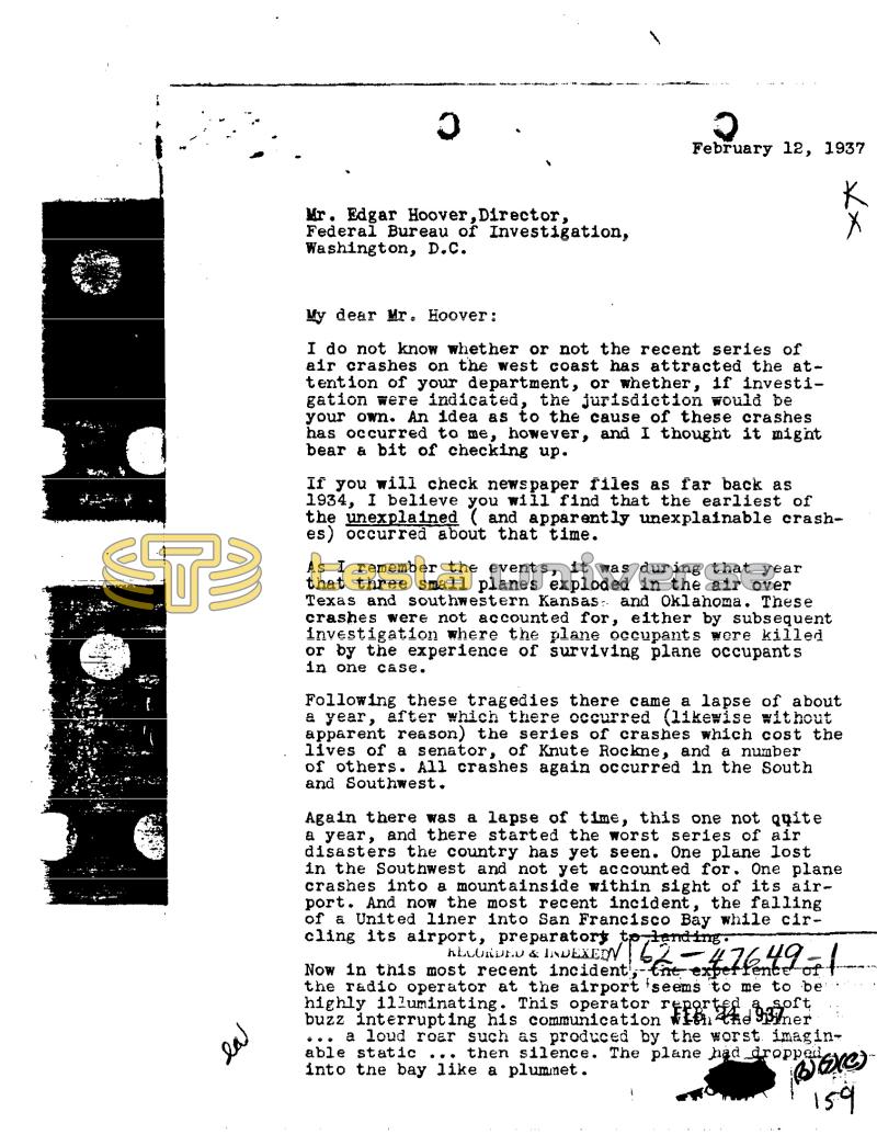 lal 0 Mr. Edgar Hoover, Director, Federal Bureau of Investigation, Washington, D.C. Q February 12, 1937 My dear Mr. Hoover: I do not know whether or not the recent series of air crashes on the west coast has attracted the attention of your department, or whether, if investigation were indicated, the jurisdiction would be your own. An idea as to the cause of these crashes has occurred to me, however, and I thought it might bear a bit of checking up. If you will check newspaper files as far back as 1934, I believe you will find that the earliest of the unexplained (and apparently unexplainable crashes) occurred about that time. As I remember the events, it was during that year that three small planes exploded in the air over Texas and southwestern Kansas and Oklahoma. These crashes were not accounted for, either by subsequent investigation where the plane occupants were killed or by the experience of surviving plane occupants in one case. Following these tragedies there came a lapse of about a year, after which there occurred (likewise without apparent reason) the series of crashes which cost the lives of a senator, of Knute Rockne, and a number of others. All crashes again occurred in the South and Southwest. Again there was a lapse of time, this one not quite a year, and there started the worst series of air disasters the country has yet seen. One plane lost in the Southwest and not yet accounted for. One plane crashes into a mountainside within sight of its airport. And now the most recent incident, the falling of a United liner into San Francisco Bay while circling its airport, preparators to lending. ALLUNDED & INDEXEIN 5-47649-1 Now in this most recent incident, the expertence of the radio operator at the airport 'seems to me to be highly illuminating. This operator reported a soft buzz interrupting his communication Fine 93er a loud roar such as produced by the worst imaginable static ... then silence. The plane had dropped into the bay like a plummet. xx Boxe 159
