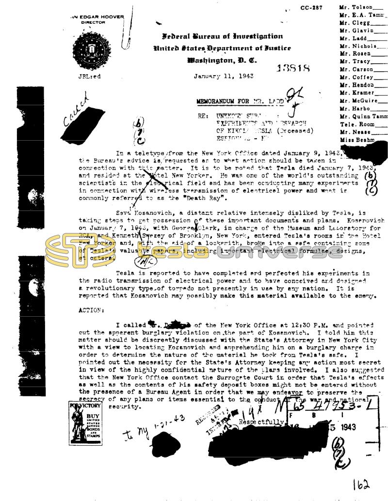 AN EDGAR HOOVER DIRECTOR T JEL:ed Cached SAJ BUY UNITED STATES Federal Bureau of Investigation United States Department of Justice Washington, D. C. January 11, 1943 BATINOS BONDS AND STAMPS MEMORANDUM FOR MR. LADD RE: to my 1-21-43 UNKNOT STR. FITRILEN ESWARCH OF NIKOL VESLA (Deceased) ESFIOR F مدن In a teletype from the New York Office dated Jamary 9, 1943,) the Bureau's advice is requested as to what action should be taken in connection with this matter. It is to be noted that Tesla died January 7, 1943 and resided at the tel New Yorker. He was one of the world's outstanding scientists in the lerical field and has been conducting many experimerts in connection with wireless trensmission of electrical power and what is commonly referred to as the "Death Ray". 89 13818 - Save Kosanovich, a distant relative intensely disliked by Tesla, is taking steps to get possession these important documents and plans. Kosenovich on January 7, 1943, with George Clark, in charge of the Museum and Laboratory for RCA, and Kenneth Swezey of Brooklyn, New York, entered Tesla's rooms in the Hotel New Yorker and, with the sid of a locksmith, broke into a safe containing some of Tesla's valuable papers, including important electrical formulee, designs, et cetere. CC-287 Tesla is reported to have completed and perfected his experiments in the radio transmission of electrical power and to have conceived and designed e revolutionary type of torpedo not presently in use by any nation. It is reported that Kosanovich may possibly make this material available to the enemy. ACTION: RECORDED GL y I called of the New York Office at 12:30 P.M. and pointed out the apparent burglary violation on the part of Kosanovich. I told him this matter should be discreetly discussed with the State's Attorney in New York City with a view to locating Focenovich and apprehending him on a burglary charge in order to determine the nature of the material he took from Tesla's safe. I pointed out the necessity for the State's Attorney keeping any action most secret in view of the highly confidential neture of the lars involved. I also suggested that the New York Office contact the Surrogate Court in order that Tesla's effects as well as the contents of his safety deposit boxes might not be entered without the presence of a Bureau Agent in order that we may endeavor to preserve the secrecy of any plans or items essential to the conduct the national POR VICTORY security. M 43 1 I 5 1943 E INTRAFO Mr. Tolson Mr. E.A. Tamm Mr. Clegg. Mr. Glavin Mr. Ladd Mr. Nichols. Mr. Rosen Mr. Tracy. Mr. Carson, Mr. Coffey Mr. Hendon Mr. Kramer Mr. McGuire, Mr. Harbo Mr. Quinn Tamm Tele. Room Mr. Nease Miss Beshm Respe ctfully, 162