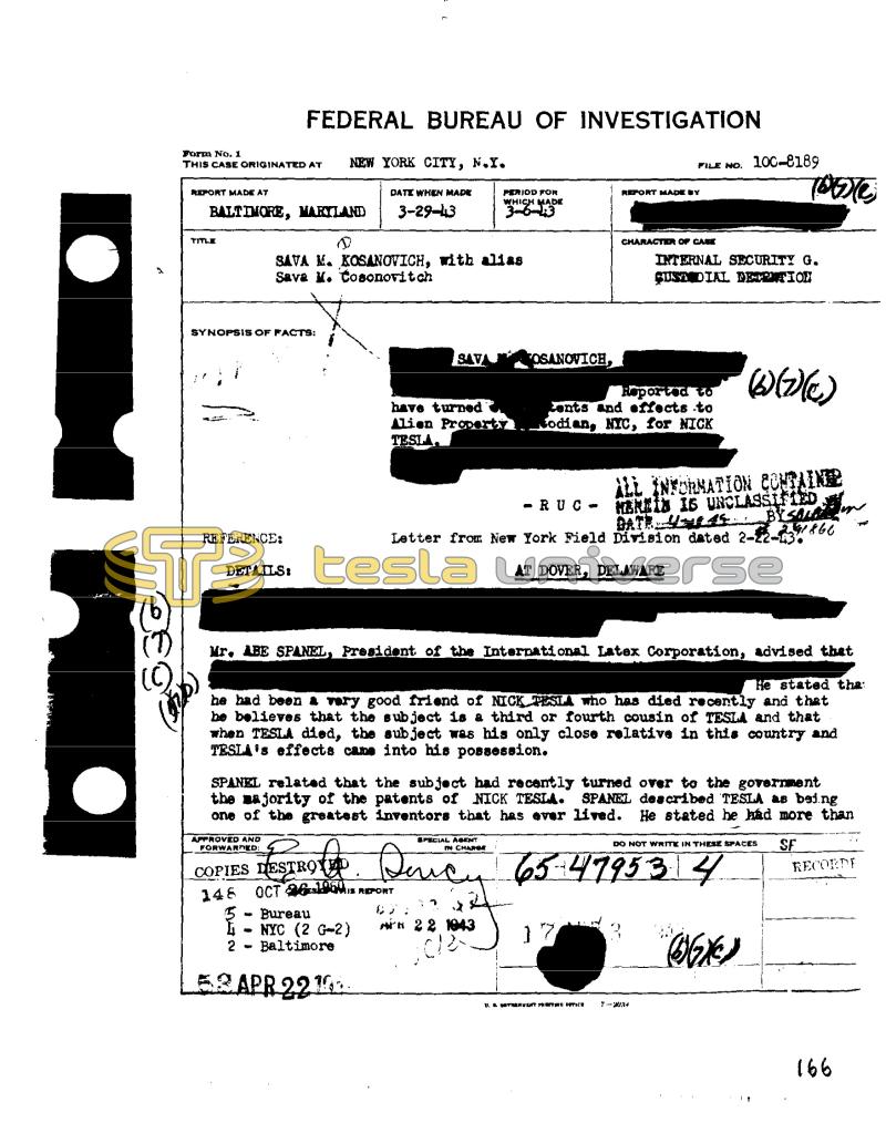 3 Form No. 1 THIS CASE ORIGINATED AT REPORT MADE AT TITLE BALTIMORE, MARYLAND A SYNOPSIS OF FACTS: REFERENCE: DETAILS: FEDERAL BUREAU OF INVESTIGATION APPROVED AND FORWARDED: SAVA M. KOSANOVICH, with alias Sava M. Cosonovitch wp COPIES HESTRO DE 146 OCT 6 ✔ NEW YORK CITY, N.Y. B DATE WHEN MADE 3-29-43 OGA Bureau NYC (2 G-2) Baltimore 5.3 APR 22 14: SAV have turned Alien Property TESLA. PERIOD FOR WHICH MADE 3-6-3 Mr. ABE SPANEL, President of the International Latex Corporation, advised that OSANOVICH, He stated tha: he had been a very good friend of NICK TESLA who has died recently and that be believes that the subject is a third or fourth cousin of TESLA and that when TESLA died, the subject was his only close relative in this country and TESLA's effects came into his possession. REPORT SPANEL related that the subject had recently turned over to the government the majority of the patents of NICK TESLA. SPANEL described TESLA as being one of the greatest inventors that has ever lived. He stated he had more than CHARGE RUC APR 22 1943 102 REPORT MADE BY FILE NO. 100-8189 CHARACTER OF CASE Reported to ents and effects to odian, NYC, for NICK ALL INFORMATION CONTAINE HEREIN IS UNCLASSIFIED BATH UNI 45 BY SOLGE 241866 Letter from New York Field Division dated 2-22-436 AT DOVER, DELAWARE INTERNAL SECURITY G. CUSTY DIAL DETENTION 1. S. SOYANVENT PRO DETICE SPECIAL AGENT Dency 65 4795 3 4 Рису 17 (66%) Towe (6)(2)(c) 72034 DO NOT WRITE IN THESE SPACES SF RECORDE 166