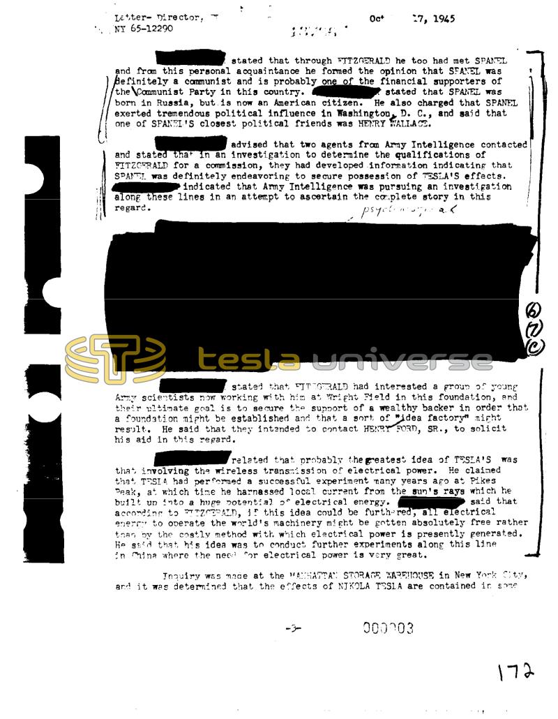 Letter Director, NY 65-12290 w Oct 27, 1945 stated that through FITZGERALD he too had met SPANEL and from this personal acquaintance he formed the opinion that SFANEL was definitely a communist and is probably one of the financial supporters of the Communist Party in this country. stated that SPANEL was born in Russia, but is now an American citizen. He also charged that SPANEL exerted tremendous political influence in Washington, D. C., and said that one of SPANEL'S closest political friends was HENRY WALLACE. advised that two agents from Army Intelligence contacted and stated that in an investigation to determine the qualifications of FITZGERALD for a commission, they had developed information indicating that SPANTI was definitely endeavoring to secure possession of TESLA'S effects. indicated that Army Intelligence was pursuing an investigation along these lines in an attempt to ascertain the complete story in this regard. psycten २८ -3stated that FIT GRALD had interested a group of young # Army scientists now working with him at Wright Field in this foundation, and their ultimate goal is to secure the support of a wealthy backer in order that a foundation might be established and that a sort of idea factory" might result. He said that they intended to contact HENRY FORD, SR., to solicit his aid in this regard. related that probably the greatest idea of TESLA'S that involving the wireless transmission of electrical power. He claimed that TESIA had performed a successful experiment many years ago at Pikes Peak, at which time he harnassed local current from the sun's rays which he built up into a huge potential of electrical energy. said that according to TTZCRALD, if this idea could be furth-red, all electrical energy to operate the world's machinery might be gotten absolutely free rather than by the costly method with which electrical power is presently generated. He said that his idea was to conduct further experiments along this line in China where the need for electrical power is very great. ODO was Inquiry was made at the MANHATTAN STORAGE WAREHOUSE in New York City, and it was determined that the effects of NIKOLA TESLA are contained in some 000003 172