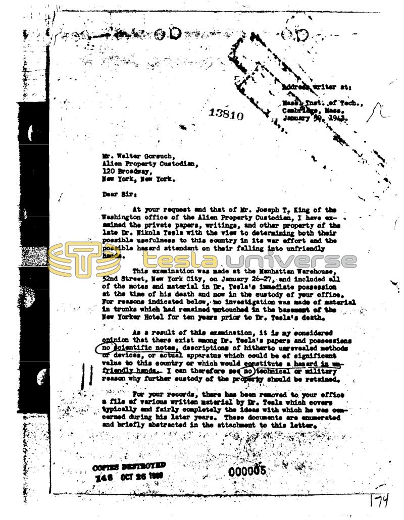 ‚.D Mr. Walter Garsuch, Alien Property Custodian, 120 Broadway, New York, New York. Dear Sirs ✓ 13810 At your request and that of Mr. Joseph Tạ King of the Washington office of the Alian Property Custodie, I have ained the private papers, writings, and other property of the late Dr. Nikola Tesla with the view to determining both their possible usefulness to this country in its war effort and the possible hasard attendant on their falling into unfriendly hands. at: of Tech., 1943. This examination was made at the Manhattan Warehouse, 52nd Street, New York City, on January 26-27, and included all of the notes and material in Dr. Tesla's immediate possession at the time of his death and now in the custody of your office. For reasons indicated below, to investigation was ade of naterial in trunks which had remained untouched in the basement of the New Yorker Hotel for ten years prior to Dr. Tesla's death, COPTES BESTROYED 148 OCT 26 1000 As a result of this exmination, it is my sonsidered opinion that there exist among Dr. Tesla's papers and possessions no scientific notes, descriptions of hitherto unrevealed methods ur devices, or actual apparatus which could be of significant value to this country or which would constitute a hasard în unfriendly handa.. I can therefore see no technical or military reason why further sustody of the pre should be retained, For your records, there has been removed to your office file of various written material by Dr. Tesla which covers typically and fairly completely the ideas with which he was cerned during his later years. These documents are emmerated and briefly abstracted in the attachment to this letter. 00000's r da. 174