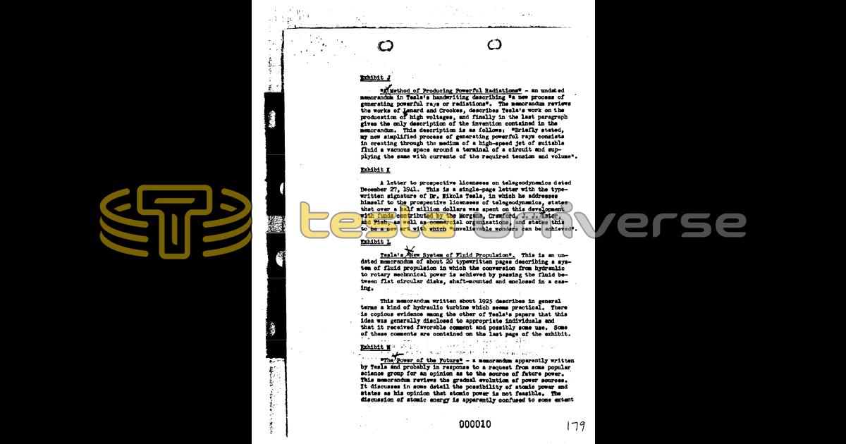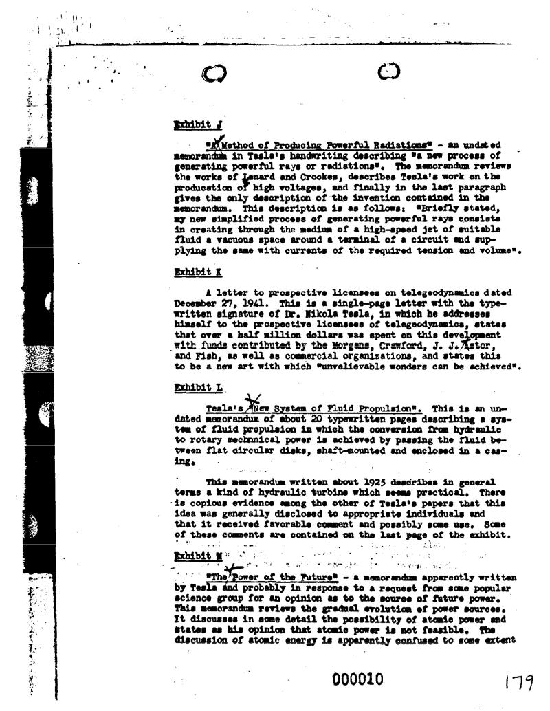 و Thibit Method of Producing Powerful Radiations" an undated memorandum in Tesla's handwriting describing "a new process of generating powerful rays or radiations". The memorandum reviews the works of anard and Crookes, describes Tesla's work on the producation of high voltages, and finally in the last paragraph gives the only description of the invention contained in the memorandum, This description is as follows: "Briefly stated, my new simplified process of generating powerful rays consists in creating through the medium of a high-speed jet of suitable fluid a vacuous space around a terminal of a circuit and supplying the same with currents of the required tension and volume", Exhibit K A letter to prospective licensees on telegeodynamics dated December 27, 1941. This is a single-page letter with the typewritten signature of Dr. Nikola Tesla, in which he addresses himself to the prospective licensees of telegeodynamics, states that over a half million dollars was spent on this development with funds contributed by the Morgans, Crawford, J. J.Astor, and Fish, as well as commercial organizations, and states this to be a new art with which #unvelievable wonders can be achieved". Exhibit L Tesla's New System of Fluid Propulsion. This is an undated memorandum of about 20 typewritten pages describing a syntem of fluid propulsion in which the conversion from hydraulic to rotary mechanical power is achieved by passing the fluid between flat aircular disks, shaft-mounted and enclosed in a casing. This memorandum written about 1925 describes in general terms a kind of hydraulic turbine which seems practical. There is copious evidence among the other of Tesla's papers that this idea was generally disclosed to appropriate individuals and that it received favorable comment and possibly some use. Some of these comments are contained on the last page of the exhibit. Exhibit "The Power of the Future" - a memorandum apparently written by Tesla and probably in response to a request from some popular science group for an opinion as to the source of future power. This memorandum reviews the gradual evolution of power sources. It discusses in some detail the possibility of atomic power and states as his opinion that atomic power is not feasible. discussion of atomic energy is apparently confused to some extent 179 000010