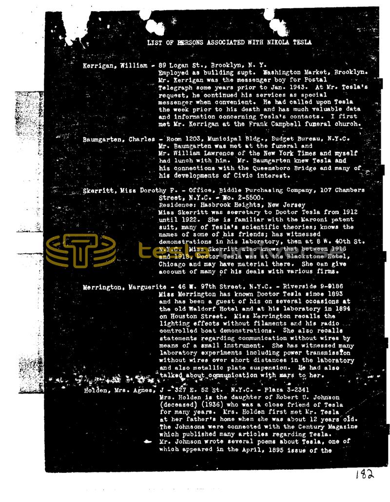 LIST OF HERSONS ASSOCIATED WITH NIKOLA TESLA Kerrigan, William Baumgarten, Charles 89 Logan St., Brooklyn, N. Y. Employed as building supt. Washington Market, Brooklyn. Mr. Xerrigan was the messenger boy for Postal Telegraph some years prior to Jan. 1943. At Mr. Tesla's request, he continued his services as special messenger when convenient. He had called upon Tesla the week prior to his death and has much valuable data and information concerning Tesla's contacts. I first met Mr. Kerrigan at the Frank Campbell funeral church. Room 1203, Municipal Bldg., Budget Bureau, N.Y.C. Mr. Baumgarten was met at the funeral and Mr. William Lawrence of the New York Times and myself had lunch with him. Mr. Baumgarten knew Tesla and his connections with the Queensboro Bridge and many of his developments of Civic interest. Skerritt, Miss Dorothy F. office, Biddle Purchasing Company, 107 Chambers Street, N.Y.C. Wo. 2-5500. Residence: Hasbrook Heights, New Jersey Miss Skerritt was secretary to Doctor Tesla from 1912 until 1922. She is familiar with the Karooni patent suit, many of Tesla's scientific theories; knows the names of some of his friends; has witnessed demonstrations in his laboratory, then at 8 W. 40th St. N.Y.C. Miss Skerritt also knows that between 1916 and 1918, Doctor Tesla was at the Blackstone Hotel, Chicago and may have material there. She can give account of many of his deals with various firms. Merrington, Marguerite - 46 W. 97th Street, N.Y.C. Riverside 9-9186 Miss Merrington has known Doctor Tesla since 1893 and has been a guest of his on several occasions at the old Waldorf Hotel and at his laboratory in 1894 on Houston Street. Kiss Merrington recalls the lighting effects without filaments and his radio controlled boat demonstrations. She also recalls statements regarding communication without wires by means of a small instrument. She has witnessed many laboratory experiments including power transmission without wires over short distances in the laboratory and also metallic plate suspension. He had also talked about communication with mars to her. f Holden, Mrs. Agnes, J-327 E. 52 st. N.Y.C. Plaza 3-2341 Mrs. Holden is the daughter of Robert U. John's on (deceased) (1936) who was a close friend of Tesla for many years. Mrs. Holden first met r. Tesla at her father's home when she was about 12 years old. The Johnsons were connected with the Century Magazine which published many articles regarding Tesla. Mr. Johnson wrote several poems about Tesla, one of which appeared in the April, 1895 issue of the 182