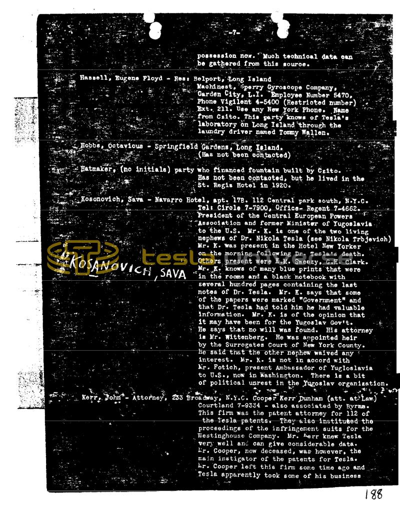 Hassell, Eugene Floyd - possession now. Much technical data gen be gathered from this source. Res: Belport, Long Island Machinest, Sperry Gyroscope Company, Garden City, L.I. Employee Number 5470, Phone Vigilent 4-5400 (Restricted number) Ext. 211. Use any New York Phone. Name from Czito. This party knows of Tesla's laboratory on Long Island through the laundry driver named Tommy Wallon. Hobbs, Octavious Springfield Gardens, Long Island, (Has not been contacted) Hatmaker, (no initials) party who financed fountain built by Czito. Has not been oontaoted, but he lived in the St. Regis Hotel in 1920. Mr. KOSANOVICH SAVA Kosonovich, Sava Navarro Hotel, apt. 178. 112 Central park south, N.Y.C. Tel: Circle 7-7900, OfficeRegent 7-4662. President of the Central European Powers Association and former Minister of Yugoslavia - to the U.S. Mr. K. is one of the two living nephews of Dr. Nikola Tesla (see Nikola Trbjovich) Mr. K. was present in the Hotel New Yorker on the morning following Dr. Tesla's death. Others present were K.M. Sweezy, G.H. Clark. • knows of many blue prints that were in the rooms and a black notebook with several hundred pages containing the last notes of Dr. Tesla. Mr. K. says that some of the papers were marked "Government" and that Dr. Tesla had told him he had valuable information. Mr. K. is of the opinion that it may have been for the Yugoslav Gov't. He says that no will was found. His attorney is Mr. Wittenberg. He was appointed heir by the Surrogates Court of New York County. He said that the other nephew waived any interest. Mr. K. is not in accord with Mr. Fotich, present Ambassador of Yugloslavia to U.S., now in Washington. There is a bit of political unrest in the Yugoslav organization. Kerr, John Attorney, 233 Broadway, N.Y.C. Cooper Kerr Dunham (att. at Law.) Courtland 7-9334 also associated by Byran. This firm was the patent attorney for 112 of the Tesla patents. They also instituted the proceedings of the infringement suits for the Westinghouse Company. Mr. Kerr knew Tesla very well and can give considerable data. Er. Cooper, now deceased, was however, the main instigator of the patents for Tesla. hir. Cooper left this firm some time ago and Tesla apparently took some of his business 188