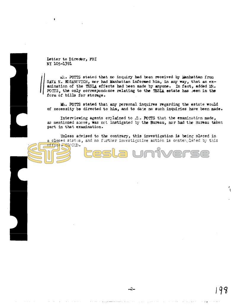 Letter to Diredor, FBI NY 105-1391 MR. POTTS stated that no inquiry had been received by Manhattan from SAVA N. KOSANOVICH, nor had Manhattan informed him, in any way, that an examination of the TESLA effects had been made by anyone. In fact, added MR. POTTS, the only correspondence relating to the TESLA estate has been in the form of bills for storage. M. POTTS stated that any personal inquires regarding the estate would of necessity be directed to him, and to date no such inquiries have been made. Interviewing agents explained to . POTTS that the examination made, as mentioned above, was not instigated by the Bureau, nor had the Bureau taken. part in that examination. Unless advised to the contrary, this investigation is being placed in a closed status, and no further investigative action is contemplated by this office. CLOSED. 198