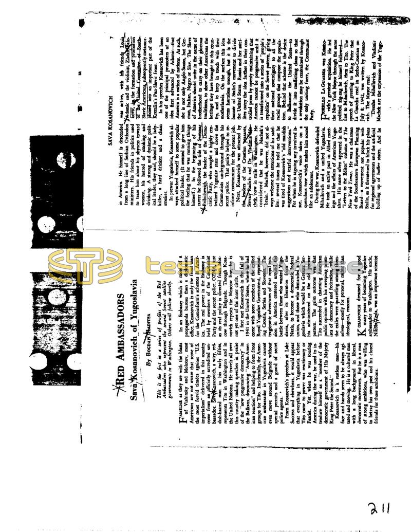211 RED AMBASSADORS Sava, Kosanovich_of_Yugoslavia By BOGDAN ADITYA This is the first in a series of profiles of the Red Ambassadors who represent the several Soviet satellite governments in Washington. Others will follow shortly. Pamiliar as they are with the blasts Molotov, most Americans are not aware that some of the most fervid tirades against "U.S. imperialistn" delivered in this country come from an officially accredited umbassador. Sava Kosanovich, a wiry, red. dish-haired man in his early fifties, represents Tito in Washington and in the United Nations. He travels all over this country making speeches in praise of the "new progressive democracy" in the Balkans, denouncing "Anglo-American reaction" and helping to form front groups for Tito. Incidentally, the Amer. ican ambassador in Yugoslavia cannot even move around Belgrade without special permits and a guard of secret police agents. U From Kosanovich's speeches at Lake Success and elsewhere, it would appear that everything in Yugoslavia before Tito came to power was reactionary or Fascist. Yet, when he was touring America during the war, he used to in troduce himself as a "member of the democratic government of His Majesty King Peter the Second." Kosanovich is à restless man-his face and hands seem to be always agitated and moving. He is a cultured man with a long background in liberal, democratic movements. But he is a man of strong ambitions, who was willing to betray his own. past and his closest friends for those ambitions. In an Embassy which is more of a propaganda bureau than a diplomatic office, Kosanovich is only the front man for the Cominform's schemes in America. The real power in the Embassy is held by members of the Communist Party and the secret police, OZNA, just as its real policy is directed from Moscow through Belgrade. Though Kosanovich repeats the Moscow line, he is not yet one of the inner circle. I first met Kosanovich in the fall of 1941 in the United States, where he had come with some members of the exiled Royal Yugoslav Government, representing Croatia, Serbia and Slovenia. The tragicomic adventures of that royal mission in America centered around the battle between those who wanted Yugoslavia, after its liberation from the Nazis, to become a democratic federal union, and those who demanded a Yugoslavia which would be a Greater Serbia administered on the old prewar pattern. The grim outcome was that Tito succeeded in charming American public opinion with his sweeping promises of democracy and federation, while the exiles were quarreling among themselves mostly for personal, rather than ideological, reasons. K OSANOVICH dreamed for a good many years of becoming Yugoslav ambassador to Washington. His uncle, Nikola Tesla, was an important scientist SAVA KOSANOVICH in America. He himself is descended from a long line of Serbian Orthodox ministers. His friends in politics used to tease him about his shyness toward women, his hatred of smoking and drinking. A strong and dynamic political leader, they said, should be a ladykiller, a hard drinker and a chain smoker. In prewar Yugoslavia, Kosanovich always attached himself to some popular political leader. (It seemed to give him the feeling that he was running things himself.) In the beginning of his career he followed the tide of Svetozar, Pribichevich, the leader of the Democratic Party, who sought a highly centralized Yugoslav state and drove the Communists underground through his secret police. That policy helped to reinforce communism for the present job. Next, Kosanovich was attracted by the leaders of the Croatian peasants, Stevan Radich and Dr. Vladimir e chek, now in exile in Washington. He considered that he was Machek's 'brain." Machek, however, did not always welcome the attentions of his satellite: several times he told me that he was tired of Kosanovich's "old maidish suggestions and tearful interventions." For when he is arguing any involved is sue, Kosanovich's voice takes on a querulous tone which makes him sound like an adolescent. During the war, Kosanovich defended Mihailovich and a united Yugoslavia. He took an active part in Allied meetings and the affairs of American Yugoslavs. His name often appeared in the "Letters to the Editor" column of The New York Times. He was a chairman of the Southeastern European Planning Board movement not popular with Stalin, as it threatened to block his plans for regional agreements and the artificial building up of buffer states. And be 34 7 was active, with h friends Louis Adamic and the violinist, Zlatko Balokovi, in the formation and promotion of the United Committee of South Slavic Americans, subsequently metamorphosed into an important part of the Kremlin's Pan-Slavic front. In his speeches Kosanovich has been one of the principal promoters of an idea first advanced by Adamic-that America is a nation of nations. As such, she is not only Anglo-Saxon, but German, Italian, Negro or Slav. The Slavs of America should unite in the name of brotherhood to carry on their glorious traditions, to show other Americans the heritage they have brought this country, and to keep in touch with their motherlands. On the surface this idea seems harmless enough, but it is the banner of Stalin's movement to divide the United States. Russia and her satellites carry the idea farther in their controlled press by openly maintaining that America cannot be progressive until it is transformed into a series of "people's republics" on the Soviet pattern, giving their national sovereignty to all the racial groups that compose the population. Behind that scheme is the desire to Balkanize the United States to divide it into conflicting clans so that a revolution may be centralized through the only uniting force, the Communist Party. FOR MORELLO LA Guardia was Kosthovich's greatest acquisition. He led the New York Mayor through the same political zig-zag he himself followedfirst to Mihailovich, then to Tito. The speech of greeting t