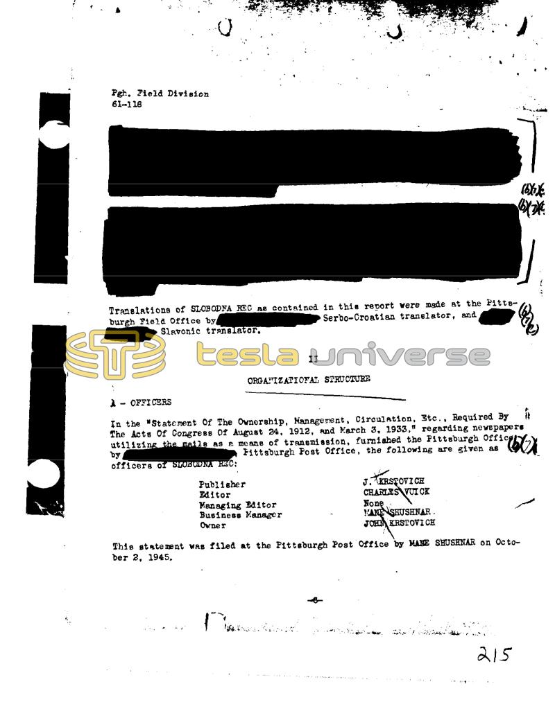 A. Pgħ. Field Division 61-118 邕 Translations of SLOBODNA REC as contained in this report were made at the PittsSerbo-Croatian translator, and burgh Field Office by Slavonic translator. II ORGANIZATIONAL STRUCTURE Publisher Editor Managing Editor Business Manager Owner À - OFFICERS In the Statement Of The Ownership, Management, Circulation, Etc., Required By The Acts Of Congress of August 24, 1912, and March 3, 1933," regarding newspapers utilizing the mails as a means of transmission, furnished the Pittsburgh Office by Fittsburgh Post Office, the following are given as officers of SLOBODNA REČ: 201 J.KRSTOVICH CHARLES VỚIOK Nonę MAN SHUSHNAR. JOHN KRSTOVICH (676x6 This statement was filed at the Pittsburgh Post Office by MANE SHUSHNAR on October 2, 1945, 215