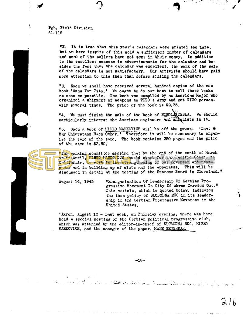 Fgh, Field Division 61-118 ? #2. It is true that this year's calendars were printed too late, but we have inspite of this sold a sufficient number of calendars and some of the sollers have not sent in their money. In addition to the excellent success in advertisements for the calendar and besides the fact that the calendar was excellent, the work of the sale of the calendars is not satisfactory. Our activists should have paid more attention to this then than before sclling the calendars, "3. Soon we shall have received several hundred copies of the new book 'Guns For Tito.ยน We ought to do our best to sell these books As soon as possible. The book was compiled by an American Major who organized a shipment of weapons to TITO's Army and met TITO personAlly Beveral times. The price of the book is $2.75. #4. We must finish the sale of the book of NIKOLA TESLA. We should particularly interest the American engineers and uitonists in it. "5. Soon a book of MIRKO MARKOVICH will be off the press: That We May Understand Each Other. Therefore it will be necessary to organize the sple of the same. The book contains 350 pages and the price of the same is $2.50. 1 "The working committee decided that by the end of the month of March or in April, MIRKO MARKOVICH should start for the Pacific Coast, to California, to work in the strengthening of our movement and newspaper and in building up of clubs and the apparatus. This will be discussed in detail at the meeting of the Supreme Board in Cleveland." August 14, 1945 "Reorganization Of Leadership Of Serbian Progressive Movement In City Of Akron Carried Out. " This article, which is quoted below, indicates the then policy of SLOBODNA REC in its leadership in the Serbian Progressive Movement in the United States. "Akron, August 10 Last week, on Thursday evening, there was here held a special meeting of the Serbien political progressive club, which was attended by the editor-in-chief of SLOBODNA REC, MIRKO MARKOVICH, and the manager of the paper, MANE SHUSHNAR. -18216
