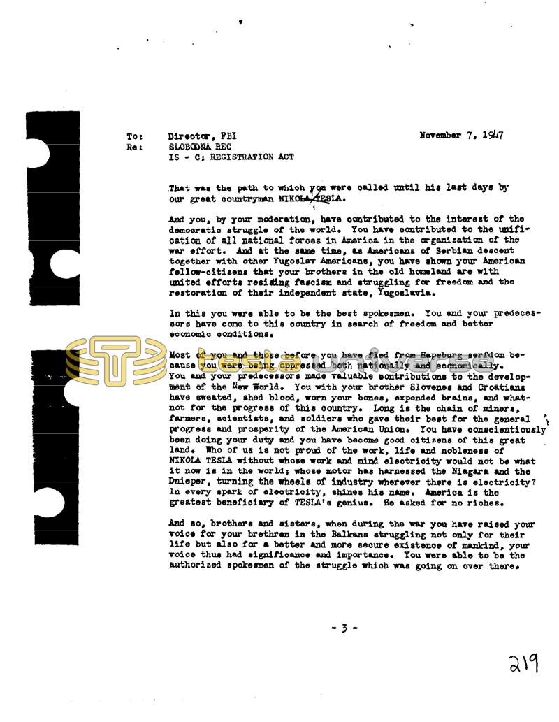 To: Re: Direotar, FBI SLOBODNA REC IS ✔ C; REGISTRATION ACT November 7, 1947 That was the path to which you were called until his last days by our great countryman NIKOLA TESLA. And you, by your moderation, have contributed to the interest of the democratic struggle of the world. You have contributed to the unification of all national forces in America in the organization of the war effort. And at the same time, as Americans of Serbian descent together with other Yugoslav Americans, you have shown your American fellow-citizens that your brothers in the old homeland are with united efforts residing fascism and struggling for freedom and the restoration of their independent state, Yugoslavia. In this you were able to be the best spokesmen. You and your predecessors have come to this country in search of freedom and better economic conditions. Most of you and those before you have fled from Hapsburg serfdom because you were being oppressed both nationally and economically. You and your predecessors made valuable contributions to the development of the New World. You with your brother Slovenes and Croatians have sweated, shed blood, worn your bones, expended brains, and whatnot for the progress of this country. Long is the chain of miners, farmers, scientists, and soldiers who gave their best for the general progress and prosperity of the American Union. You have conscientiously been doing your duty and you have become good citizens of this great land. Who of us is not proud of the work, life and nobleness of NIKOLA TESLA without whose work and mind electricity would not be what it now is in the world; whose motor has harnessed the Niagara and the Dnieper, turning the wheels of industry wherever there is electricity? In every spark of electricity, shines his name. America is the greatest beneficiary of TESLA's genius. He asked for no riches. And so, brothers and sisters, when during the war you have raised your voice for your brethren in the Balkans struggling not only for their life but also for a better and more secure existence of mankind, your voice thus had significance and importance. You were able to be the authorized spokesmen of the struggle which was going on over there. 3 219