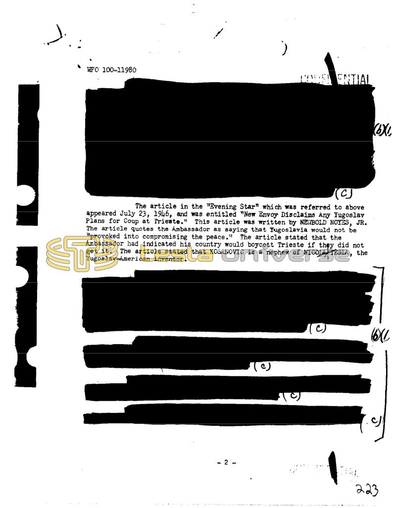 FO 100-11980 CJ The article in the "Evening Star" which was referred to above appeared July 23, 1946, and was entitled "New Envoy Disclaims Any Yugoslav Plans for Coup at Trieste." This article was written by NEWBOLD NOYES, JR. The article quotes the Ambassador as saying that Yugoslavia would not be "provoked into compromising the peace." The article stated that the Ambassador had indicated his country would boycott Trieste if they did not get it. The article stated that KOSANOVIC is a nephew of NICOLA TESLA, the Yugoslav-American inventor. I - 2 COBERENTIAL c) (C) bu 61 223