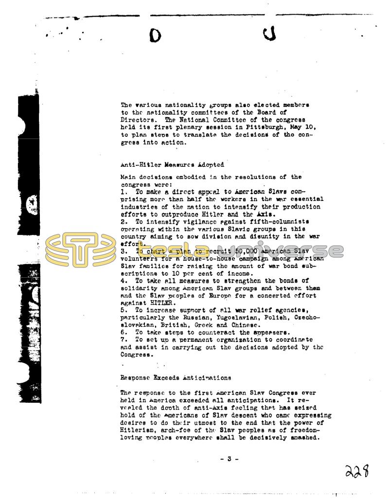 0 J The various nationality groups al elected members to the nationality committees of the Board of Directors. The National Committee of the congress held its first plenary session in Pittsburgh, May 10, to plan steps to translate the decisions of the congress into action. Anti-Hitler Measures Adopted Main decisions embodied in the resolutions of the congress were: 1. To make a direct appeal to American Slava comprising more than half the workers in the war essential industries of the nation to intensify their production efforts to outproduce Hitler and the Axis. 2. To intensify vigilance against fifth-columnists operating within the various Slavic groups in this country aiming to sow division and disunity in the war effort. 3. To chart a plan to recruit 50,000 american Slav volunteers for a house-to-house campaign among American Slav families for raising the amount of war bond subscriptions to 10 per cent of income. 4. To take all measures to strengthen the bonds of solidarity among American Slav groups and between them and the Slav peoples of Europe for a concerted effort against HITLER. 5. To increase support of all war relief agencies, particularly the Russian, Yugoslavian, Polish, Czechoslovakian, British, Greek and Chinese. 6. To take steps to counteract the appeasers. 7. To set up a permanent organization to coordine te and assist in carrying out the decisions adopted by the Congress. Response Exceeds Anticipations The response to the first American Slav Congress ever held in America exceeded all anticipations. It reveeled the depth of anti-Axis feeling that has seized hold of the Americans of Slav descent who came expressing desires to do their utmost to the end that the power of Hitlerism, arch-foe of the Slav peoples as of freedomloving peoples everywhere shall be decisively smashed. 3 228