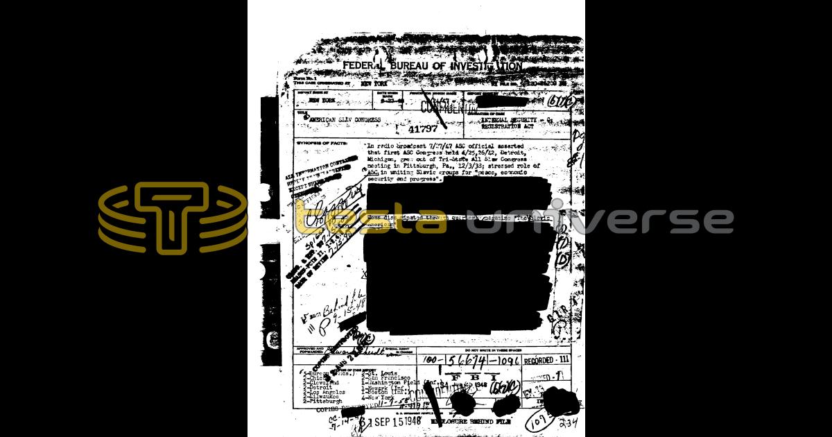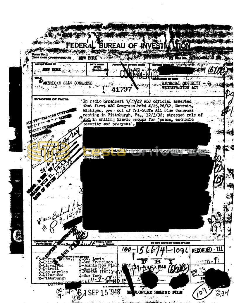 € FORK AMERICAN SLIV CONGRESS SYNOPSIS OF FACTS: FEDERAL BUREAU OF INVESTIT ALS THORMATION CONTRE HEPE'F T'N TASSEN EXCEFT WHI OFFICE Cha ||| SPIESKIPB *mn . #7-/ 5-544 130#-FEIN II, 1-2.4.11 SAIR OF REVIEW 2-15-90 Behind file 18 ENCI P9-1 APPROVED AND POPWARDED: TES OF THIS Bure au Encs.). -Chic -Cleveland -Detroit Los Angeles Milwaukee 2-Pittsburgh DA COPIES DEP CC14Chendt 41797 In redio broadcast 7/27/47 ASC official asserted that first ASC Congress held 4/25,26/42, Detroit, Michigan, gre:: out of Tri-State All Star Congress meeting in Pittsburgh, Pa,, `12/3/38; stressed role of ASC, in uniting Slavic groups for "péace, esmade security and progress". SPECIAL AGENT IN CHARGE COMRADE IN C Hows disseminated through quarterNmagazine "The Slavic American" Louis San Francisco 1-lashington Field Boston (Inf TERNAL SECURITI METISTRATION ACT 4-New York YED/1-1 F B . 1948 DO NOT WRITE IN THERE 100-156674-1096 RECORDED - 111 EXED-11 FACES (DOC) 6. S. UPPRENTMENT PRIETIES SEP 151948 LOSURE REFUND FILM bue 109 Q 2-34