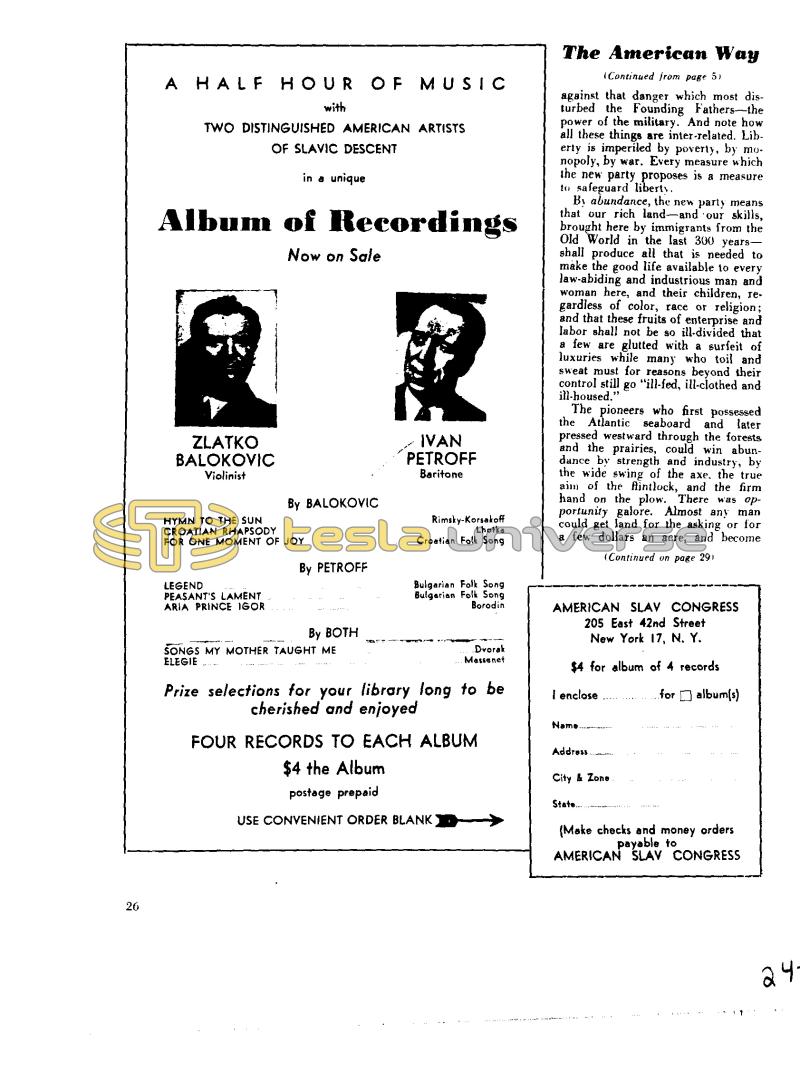 26 A HALF HOUR OF MUSIC with TWO DISTINGUISHED AMERICAN ARTISTS OF SLAVIC DESCENT in a unique Album of Recordings Now on Sale ZLATKO BALOKOVIC Violinist By BALOKOVIC HYMN TO THE SUN CROATIAN RHAPSODY FOR ONE MOMENT OF JOY LEGEND PEASANT'S LAMENT ARIA PRINCE IGOR By PETROFF By BOTH SONGS MY MOTHER TAUGHT ME ELEGIE IVAN PETROFF Baritone Rimsky-Korsakoff Croatian Folk Song Lhotka Bulgarian Folk Song Bulgarian Folk Song Borodin Dvorak Massenet Prize selections for your library long to be cherished and enjoyed FOUR RECORDS TO EACH ALBUM $4 the Album postage prepaid USE CONVENIENT ORDER BLANK) The American Way (Continued from page 5) against that danger which most disturbed the Founding Fathers-the power of the military. And note how all these things are inter-related. Liberty is imperiled by poverty, by monopoly, by war. Every measure which the new party proposes is a measure to safeguard liberty. By abundance, the new party means that our rich land-and our skills, brought here by immigrants from the Old World in the last 300 yearsshall produce all that is needed to make the good life available to every law-abiding and industrious man and woman here, and their children, regardless of color, race or religion; and that these fruits of enterprise and labor shall not be so ill-divided that a few are glutted with a surfeit of luxuries while many who toil and sweat must for reasons beyond their control still go "ill-fed, ill-clothed and ill-housed." The pioneers who first possessed the Atlantic seaboard and later pressed westward through the forests and the prairies, could win abundance by strength and industry, by the wide swing of the axe. the true aim of the flintlock, and the firm hand on the plow. There was opportunity galore. Almost any man could get land for the asking or for a few dollars an acre, and become (Continued on page 291 AMERICAN SLAV CONGRESS 205 East 42nd Street New York 17, N. Y. $4 for album of 4 records I enclose Name Address. City & Zone State... for album(s) (Make checks and money orders payable to AMERICAN SLAV CONGRESS 24