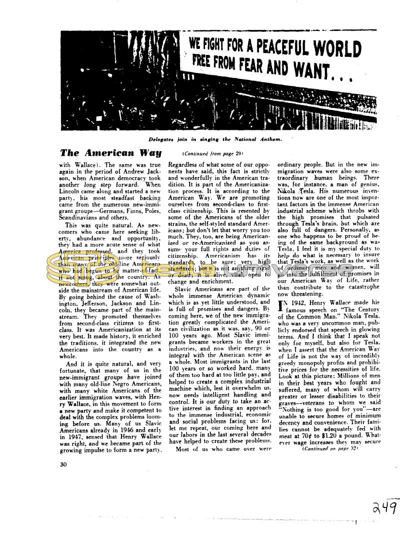 MW ľ The American Way with Wallace). The same was true again in the period of Andrew Jackson, when American democracy took another long step forward. When Lincoln came along and started a new party, his most steadfast backing came from the numerous new-immigrant groups-Germans, Finns, Poles, Scandinavians and others. 30 This was quite natural. As new. comers who came here seeking liberty, abundance and opportunity, they had a more acute sense of what America professed, and they took American principles more seriously than many of the old-line Americans who had begun to be matter-of-fact, if not smug, about the country. As newcomers, they were somewhat outside the mainstream of American life. By going behind the cause of Wash. ington, Jefferson, Jackson and Lincoln, they became part of the mainstream. They promoted themselves from second-class citizens to firstclass. It was Americanization at its very best. It made history, it enriched the traditions, it integrated the new Americans into the country as a whole. Delegates join in singing the National Anthem. (Continued from page 29) Regardless of what some of our opponents have said, this fact is strictly and wonderfully in the American tradition. It is part of the Americaniza. tion process. It is according to the American Way. We are promoting ourselves from second-class to firstclass citizenship. This is resented by some of the Americans of the older strains, the self-styled standard Amer icans; but don't let that worry you too much. They, too, are being Americanized or re-Americanized as you as sume your full rights and duties of citizenship. Americanism has its standards, to be sure; very high standards; but it is not anything rigid or dead; it is alive, vital, open to change and enrichment. And it is quite natural, and very fortunate, that many of us in the new-immigrant groups have joined with many old-line Negro Americans, with many white Americans of the earlier immigration waves, with Henry Wallace, in this movement to form a new party and make it competent to deal with the complex problems looming before us. Many of us Slavic Americans already in 1946 and early in 1947, sensed that Henry Wallace was right, and we became part of the growing impulse to form a new party. WE FIGHT FOR A PEACEFUL WORLD FREE FROM FEAR AND WANT.. 100 ordinary people. But in the new immigration waves were also some extraordinary human beings. There was, for instance, a man of genius, Nikola Tesla. His numerous inven. tions now are one of the most impor. tant factors in the immense American industrial scheme which throbs with the high promises that pulsated through Tesla's brain, but which are also full of dangers. Personally, as one who happens to be proud of being of the same background as was Tesla, I feel it is my special duty to help do what is necessary to insure that Tesla's work, as well as the work of ordinary men and women, will go into the fulfillment of promises in our American Way of Life, rather than contribute to the catastrophe now threatening. Slavic Americans are part of the whole immense American dynamic which is as yet little understood, and is full of promises and dangers. By coming here, we of the new immigration greatly complicated the American civilization as it was, say, 90 or 100 years ago. Most Slavic immigrants became workers in the great industries, and now their energy is integral with the American scene as a whole. Most immigrants in the last 100 years or so worked hard. many of them too hard at too little pay, and helped to create a complex industrial machine which, lest it overwhelm us. now needs intelligent handling and control. It is our duty to take an active interest in finding an approach to the immense industrial, economic and social problems facing us: for. let me repeat, our coming here and our labors in the last several decades have helped to create these problems. Most of us who came over were 1942, Henry Wallace made his famous speech on "The Century of the Common Man." Nikola Tesla. who was a very uncommon man, publicly endorsed that speech in glowing terms. And I think that I speak not only for myself, but also for Tesla. when I assert that the American Way of Life is not the way of incredibly greedy monopoly profits and prohibitive prices for the necessities of life. Look at this picture: Millions of men in their best years who fought and suffered, many of whom will carry greater or lesser disabilities to their graves-veterans to whom we said Nothing is too good for you"-are unable to secure homes of minimum decency and convenience. Their fami. lies cannot be adequately fed with meat at 70 to $1.20 a pound. Whatever wage increases they may secure (Continued on page 32¹ 249
