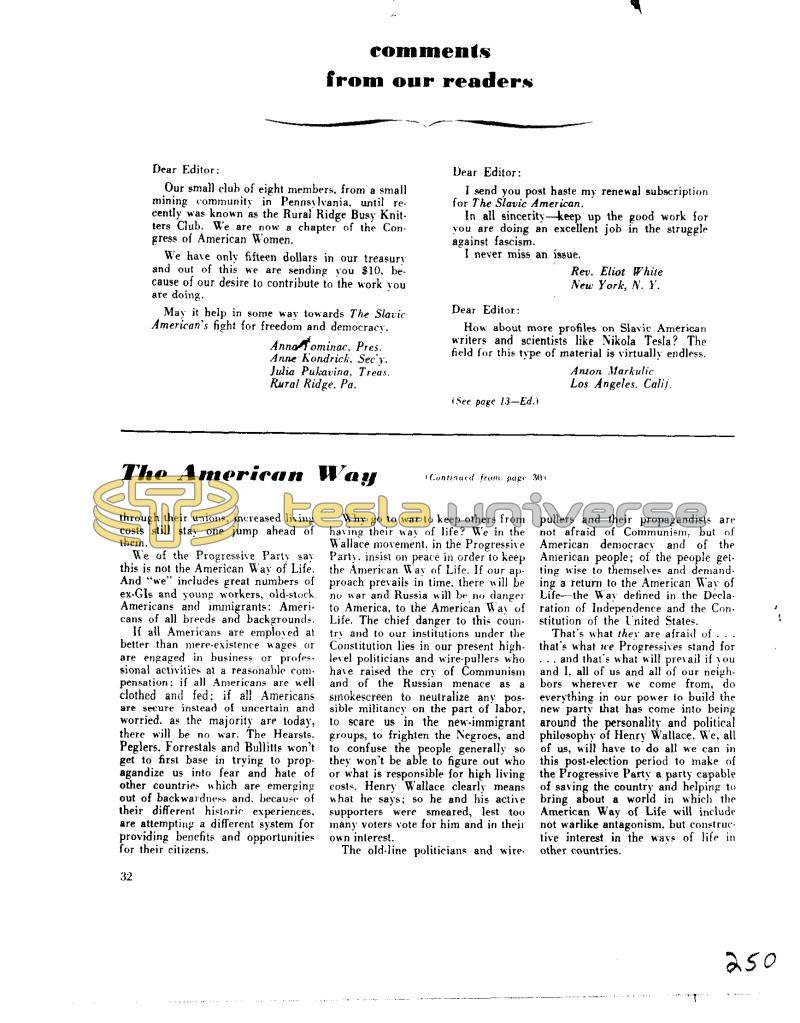 comments from our readers Dear Editor: Our small club of eight members. from a small mining community in Pennsylvania, until recently was know as the Rural Ridge Busy Knitters Club. We are now a chapter of the Congress of American Women. 32 We have only fifteen dollars in our treasury and out of this we are sending you $10, because of our desire to contribute to the work you are doing. May it help in some way towards The Slavic American's fight for freedom and democracy. Anna Tominac, Pres. Anne Kondrick. Secy. Julia Pukavina, Treas. Rural Ridge. Pa. The American Way through their unions, increased living costs still stay one jump ahead of them. We of the Progressive Party say this is not the American Way of Life. And "we" includes great numbers of ex-Gls and young workers, old-stock Americans and immigrants: Americans of all breeds and backgrounds. If all Americans are employed at better than mere-existence wages or are engaged in business or professional activities at a reasonable com pensation; if all Americans are well clothed and fed; if all Americans are secure instead of uncertain and worried. as the majority are today, there will be no war. The Hearsts. Peglers, Forrestals and Bullitts won't get to first base in trying to propagandize us into fear and hate of other countries which are emerging out of backwardness and, because of their different historic experiences, are attempting a different system for providing benefits and opportunities for their citizens. Dear Editor: I send you post haste my renewal subscription for The Slavic American. In all sincerity-keep up the good work for you are doing an excellent job in the struggle against fascism. I never miss an issue. Dear Editor: How about more profiles on Slavic American writers and scientists like Nikola Tesla? The field for this type of material is virtually endless. Anton Markulic Los Angeles, Calif. (See page 13-Ed.) Continued from page 30 Rev. Eliot White New York, N. Y. Why go to war to keep others from having their way of life? We in the Wallace movement. in the Progressive Party. insist on peace in order to keep the American Way of Life. If our approach prevails in time, there will be no war and Russia will be no danger to America, to the American Way of Life. The chief danger to this coun try and to our institutions under the Constitution lies in our present highlevel politicians and wire-pullers who have raised the cry of Communism and of the Russian menace as a smokescreen to neutralize any possible militancy on the part of labor, to scare us in the new-immigrant groups, to frighten the Negroes, and to confuse the people generally so they won't be able to figure out who or what is responsible for high living costs. Henry Wallace clearly means what he says; so he and his active supporters were smeared, lest too many voters vote for him and in their own interest. The old-line politicians and wire. pullers and their propagandists are not afraid of Communism, but of American democracy and of the American people; of the people get. ting wise to themselves and demand. ing a return to the American Way of Lifethe Way defined in the Declaration of Independence and the Constitution of the United States. That's what they are afraid of .. that's what we Progressives stand for and that's what will prevail if you and I, all of us and all of our neighbors wherever we come from, do everything in our power to build the new party that has come into being around the personality and political philosophy of Henry Wallace. We, all of us, will have to do all we can in this post-election period to make of the Progressive Party a party capable of saving the country and helping to bring about a world in which the American Way of Life will include not warlike antagonism, but constructive interest in the ways of life in other countries. 250