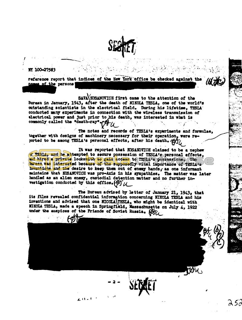 NY 100-27583 SECRET reference report that indices of the New York office be checked against the names of the persons SAVA KOSANOVICH first came to the attention of the Bureau in January, 1943, after the death of NIKOLA TESLA, one of the world's outstanding scientists in the electrical field. During his lifetime, TESLA conducted many experiments in connection with the wireless transmission of electrical power and just prior to his death, was interested in what is commonly called the "death-ray", you The notes and records of TESLA's experiments and formulae, together with designs of machinery necessary for their operation, were reported to be among TESLA's personal effects, after his death. It was reported that KOSANOVICH claimed to be a nephew of TESLA, and he attempted to secure possession of TESLA's personal effects, and hired a private locksmith to gain access to TESLA's possessions. The Bureau was interested because of the supposedly vital importance of TESLA's inventions and the desire to keep them out of enemy hands, as one informant maintains that KOSANOVICH was pro-Axis in his sympathies. The matter was later handled as an alien enemy, custodial detention matter and no further investigation conducted by this office. The Bureau advised by letter of January 21, 1943, that its files revealed confidential information concerning NIKOLA TESLA and his inventions and advised that one NICOLA TESLA, who might be identical with NIKOLA TESLA, made a speech in Springfield, Massachusetts on July 4, 1922 under the auspices of the Friends of Soviet Russia. fost C SECRET you 252