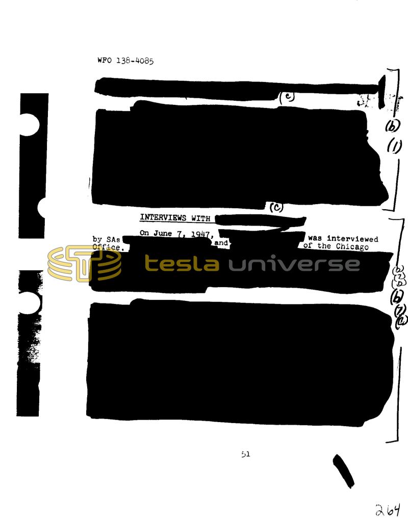 Nikola Tesla Documents Receipts, papers, notes and files related to Nikola Tesla Nikola Tesla FBI Files - Page 264 WFO 138–4085 by SAS office. INTERVIEWS WITH On June 7, 1947, and 51 S was interviewed of the Chicago (1) & 264 Pagination First page First item Previous page Previous item Next page Next item Last page Last item Within the Universe Books Books written by and about Nikola Tesla. Quotes Profound and insightful quotes by Nikola Tesla. Patents Nikola Tesla held around 200 patents worldwide. Timeline Important moments and events related to Tesla. Articles Nikola Tesla in the press. Images Nikola Tesla image and photo library. Landmarks Locations related to Nikola Tesla. Letters Letters to, from and about Nikola Tesla. Movies and TV Nikola Tesla on the screen.