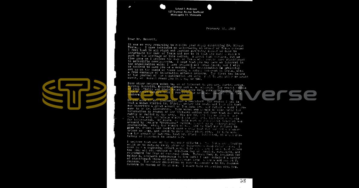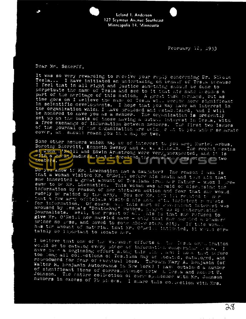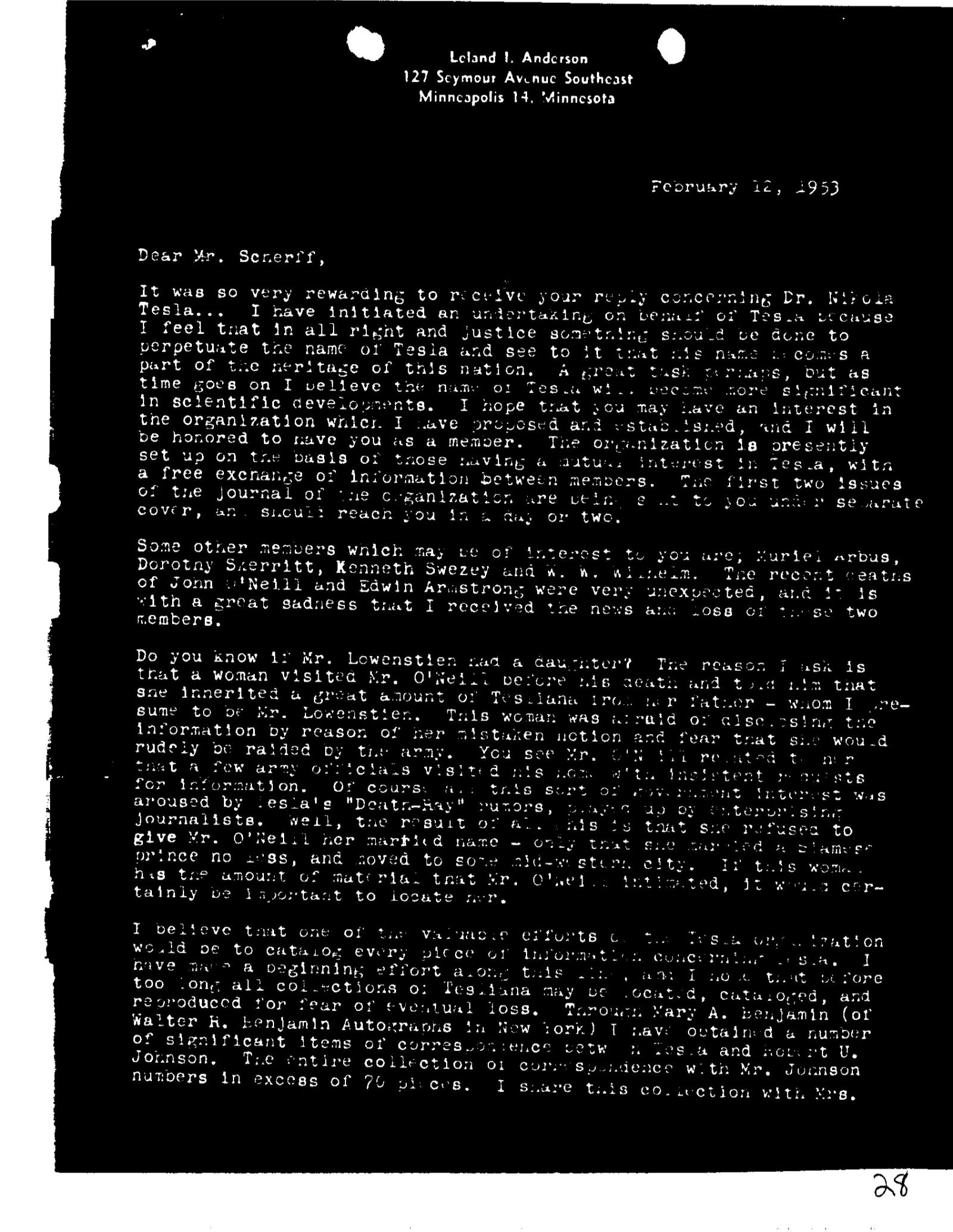Leland 1. Anderson 127 Seymour Avenue Southeast Minneapolis 14, Minnesota February 12, 1953 Dear Ar. Senerff, It was Tesla... so very rewarding to receive your reply concerning Dr. Nikola I have initiated an undertaking on benair of Tesla because I feel that in all right and justice something should be done to perpetuate the name of Tesla and see to it that is name L: COMES A part of the heritage of this nation. A great tash porians, but as time goes on I believe the name OI Tes. wi.. nore simificant in scientific developments. I hope that you may have an interest in the organization which. I have proposed and established, and I will be honored to have you as a member. The organization is presently set up on the basis of those having a autur. interest in Tesla, with a free exchange or information between members. The first two issues of the journal of the c.ganization are vein. to you under se arute cover, an Siculi reach you in a day or two. M Some other members which may be of interest Dorotny Skerritt, Kenneth Swezey and W. to you are; Huriei arbus, winem. The recent ceatns of Jonn 'Neill and Edwin Armstrong were very unexpected, and it is with a great sadness that I received the news and LOSB members. se two Do you know 1 Mr. Lowenstien nad a daughter? The reason I SA is that a woman visited Mr. O'Neill before his death and told him that sne innerited a great amount of Testiana from t r father Whom I sume to be Mr. Lowenstien. This woman was a raid or aise.csing the information by reason of her mistaken uction and fear that Si. Wou.d rudely be raided by the army. You see Xr. Cu L rested t that a few army oriclaïs visited is om W'th insistent ou sis for information. Of cours: tris sort of MOV, MOnt Interest WAS aroused by esla's "Deatr-Ray" Putors, prajic up by enterprising Journalists . well, the result of al. his is that se refused to give Mr. O'Neill her married name only that 1.0 prince no ss, and moved to sore ald-w.stern city. Ir tais WOME has the amount of material that Mr. Oel. intimated, it wou car-tainly be important to locate nur, Alamys S.L OP tration concernit S.A. I I TO A that before and I believe that one of valuable efforts C would be to catalog every piece of informati Dave MACS a beginning effort along this too long all collections o: Tesliana may De located, cutulojed, reproduced for fear of eventual loss. Thrown Nary A. benjamin (of Walter R. Benjamin Autographs in New York) I hav outained a number of significant items of correspondence betw Tes & and hot rt U. Johnson. The entire collection of comm Spendence with Mr. Jonnson numbers in excess of 70 places. I share this co.lection with Mrs. 28