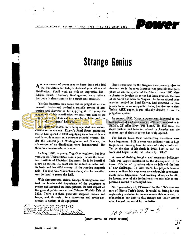 LOUIS N ROWLEY, EDITOR MAY 1955 ESTABLISHED 1882 A SK ANY GROUP of power men to name those who laid the foundation for today's electrical generation and distribution. You'll wind up with an impressive list Edison, Brush, Thomson, Westinghouse, many others. But there is almost sure to be a significant omission. Strange Genius Yet this forgotten man conceived the polyphase ac mo. tor-still basic-and devised a suitable system of generation and distribution for applying it. To grasp the magnitude of this contribution, we must turn back to the 1880's when the electrical era was being born, and the "battle of the systems" held sway. Arc lights and motors were being operated on constantcurrent series systems. Edison's Pearl Street generating station had opened in 1882, supplying incandescent lamps and, later, de motors on a constant-potential system. Under the leadership of Westinghouse and Stanley, the advantages of ac distribution were demonstrated. But there was no successful ac motor. ALL INFORMATION CONTAINED HERDIN IS UNCLASSIFIED DARES BYS In May, 1888, a young Yugo-Slav engineer, but four years in the United States, read a paper before the American Institute of Electrical Engineers. In it he described a new ac system. Its heart was the induction motor with its basic and beautiful concept of the rotating magnetic field. The man was Nikola Tesla, the system he described was destined to sweep the field. POWER. MAY 1955 With characteristic vision, George Westinghouse real. ized the fundamental importance of the polyphase ac system and acquired the basic patents. Its first impact on the general public was at the Chicago World's Fair of 1893. There a 2-phase generator supplied motors and lamps, and, through rotary converters and motor-generators, a variety of de equipment. Power But it remained for the Niagara Falls power project to demonstrate in the most dramatic way possible that poly. phase ac was the system of the future. Since 1886 when a charter to develop its power had been granted, the eyes of the world had been on Niagara. An international commission, headed by Lord Kelvin, had reviewed 17 proposals, found none acceptable. Later, just five years after Tesla's AIEE paper, it was officially decided to use the polyphase system. In August, 1895, Niagara power was delivered to the first industrial customer and in 1896 ac transmission to Buffalo, 22 miles away, was begun. By that time, the steam turbine had been introduced in America and the modern age of electric power had truly opened. For Nikola Tesla, these far-reaching inventions were but a beginning. Still to come was, brilliant work in high frequencies, thinking basic to much of today's radio art. Yet by the time of his death in 1943, both he and his work had begun to slip into obscurity. Why? A man of flashing insights and enormous brilliance, Tesla was largely indifferent to the development of his ideas. This he left to others while he followed the lure of new challenges. In later years, his projects became more grandiose, his ways more mysterious, his pronouncements more Olympian. And working alone, as he did, he formed none of the institutional ties that help to per. petuate a record of accomplishment. Next year-July 10, 1956-will be the 100th anniversary of Nikola Tesla's birth. It would be fitting for our engineering societies to commemorate this occasion, to acknowledge our debt to this strange and lonely genius who changed our world for the better. 100-2237-5 (REPRINTED BY PERMISSION) 35
