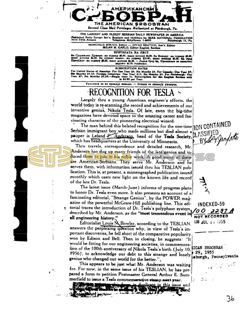 J АМЕРИКАНСКИ С.БОБРАН THE AMERICAN, SRBOBRAN Second Class Mail Privileges Authorized at Pittsburgh, Pa. THE LARGEST AND OLDEST SERBIAN DAILY NEWSPAPER IN AMERICA Published Daily Except Sat's, Sundays and Holidays by SERB NATIONAL FEDERATION 3414 Fifth Avenue Telephone Mayflower 1-6600 Pittsburgh 13, Pa MOMCHILO, SOKICH, Editor - JOVAN BRATICH, A't. Editor MILAN M. KARLO, Editor English Section ПРЕТПЛАТА НА ДИст Ва СЈеди оке Држ е: к год у 18.00; шест месеца М.Ю. 8. Калаху: да году 00.00; шот месеца 4.50. 8 отрае векое; на год у 10.00; шоот хоода (5.00. В град Пхтобург: на год у 09.00; шест месеци 14.50. - Један број п. Препать на со ко $4.00 rox==ė. SUBSCRIPTION RATES For United States of America: For Ope Year $8; Six Months $4. For Canada: One Year 39: Six Months $4.50: Foreign Countries: One Year $10; Sis Months $5. For Pittsburgh: One Year 39: Six Months $4.50.-Single copy 5c. Subscription for the English Section only in $4.00 per Year. Pуkоnс сe me panajy е. Orusoy oe anasjy yupox. RECOGNITION FOR TESLA Largely thru a young American, engineer's efforts, the world today is re-scanning the record and achievements of our inventive genius, Nikola Tesla. Of late, even the big-time magazines have devoted space to the amazing career and fascinating character of the pioneering electrical wizard. The man behind this belated recognition for the one-time) Serbian immigrant boy who made millions but died almost a pauper is Leland P. Anderson, head of the Tesla Society, which has headquarters at the University of Minnesota. ION CONTAINED CLASSIFIED Thru travels, correspondence and detailed research, Mr. Anderson has dug up many friends of the late genius and induced them to join in his noble work. A good many of these are American-Serbians. They serve Mr. Anderson and he serves them, with information issued thru his TESLIAN publication. This is, at present, a mimeographed publication issued monthly which casts new light on the known life and record of the late Dr. Tesla. BY SC 4 Jumpate 771-Y The latest issue (March-June) informs of progress plans to honor Dr. Tesla even more. It also presents an account of al fascinating editorial, "Strange Genius", by the POWER magazine of the powerful McGraw-Hill publishing line. This editorial traces the introduction of Dr. Tesla's polyphase system, INDEXED-59 described by Mr. Anderson, as the "most tremendous event in in /00 2237 A NOT RECORDED all engineering history." Editorialist Louis Bowler, according to the TESLIAN. 138 JUL 11 1355 answers the perplexing question why, in view of Tesla's important discoveries, he fell short of the comparative popularity won by Edison and Bell. Then in losing, he suggests: would be fitting for our engineering societies, in commemoration of the 100th anniversary of Nikola Tesla's birth (July 10, ICAN SRBOBRAN 1956), to acknowledge our debt to this strange and lonely genius who changed our world for the better.". 29, 1955 sburgh, Pennsylvania This appears to be just what Mr. Anderson was waiting for. For now, in the same issue of his TESLIAN, he has prepared a form to petition Postmaster General Arthur E. Summerfield to issue a Tesla commemorative stamp next year. duplicate in this issue and 36