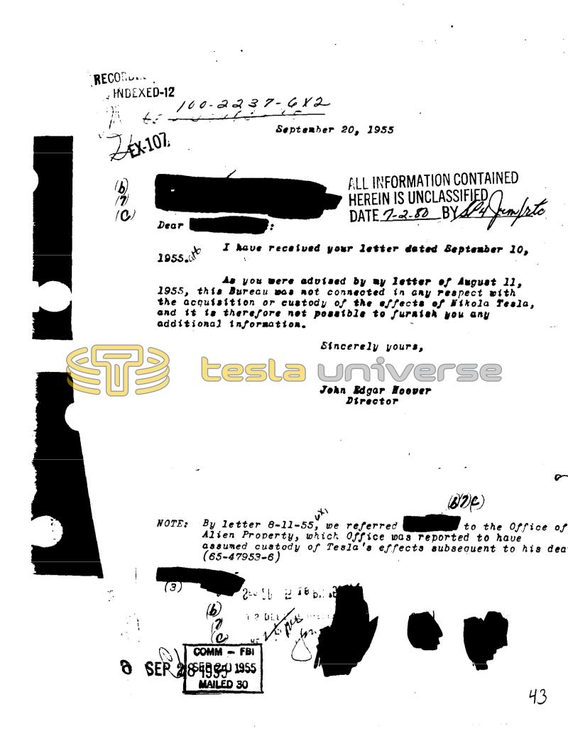 C RECO... HNDEXED-12 68 ZEX-107 17 (C) 100-2237-6x2 L Dear 1955, NOTE: (3) September 20, 1955 As you were advised by my letter of August 11, 1955, this Bureau was not connected in any respect with the acquisition or custody of the effects of Nikola Tesla, and it is therefore not possible to furnish you any additional information. I have received your letter dated September 10, K COMM FBI O SER 2849 1955 MAILED 30 12 DLE ALL INFORMATION CONTAINED HEREIN IS UNCLASSIFIED DATE 7-2-80 BYA By letter 8-11-55, we referred 6x1 (B26) to the Office of Alien Property, which office was reported to have assumed custody of Tesla's effects subsequent to his deat (65-47953-6) 25-06 2 16 bil Miss Sincerely yours, 42. Silly Jempsto John Edgar Hoover Director 43