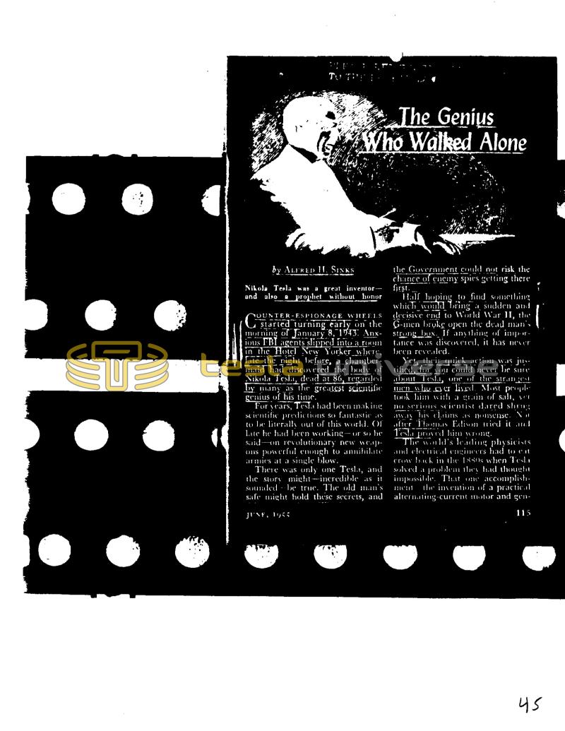 TU The Genius Who Walked Alone by ALFRED HI. SINKS Nikola Tesla was a great inventorand also a prophet without honor WHEELS C Started turning early on the morning of January 8, 1943. Anxious FBI agents slipped into a room in the Hotel New Yorker where, Late the night before, a chambermaid had discovered the body of Nikola Tesla, dead at 86, regarded by many as the greatest scientifie genius of his time. For years, Tesla had been making scientific predictions so fantastic as to be literally out of this world. Of late he had been working or so he said-on revolutionary new weap ons powerful enough to annihilate armies at a single blow. There was only one Tesla, and the story might-incredible as it sounded be true. The old man's safe might hold these secrets, and JUNE, 1955 the Government could not risk the chance of enemy spies getting there first. Half hoping to find something which would bring a sudden and decisive end to World War II, the G-men broke open the dead man's strong box. If anything of importance was discovered, it has never been revealed. Yet, their quick action was jus tified, for you could never De Sure about Tesla, one of the strangest men who ever lived. Most people took him with a grain of salt, ver no serious scientist dared shrug away his claims as nonsense. N after Thomas Edison ried it and Tesla proved him wrong. The world's leading physicists and electrical engineers had to eat crow back in the 1880s when Tesla solved a problem they had thought impossible. That one accomplishment the invention of a practical alternating-current motor and gen115 i 45