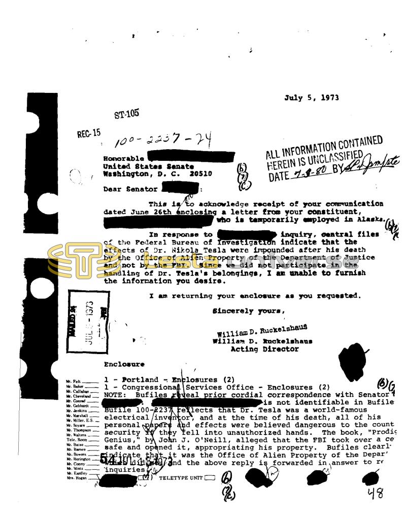 SETT REC-15 f JUL-1373 Mr. Felt Mr. Baker Mr. Callahan Mr. Cleveland Mr. Conrad Mr. Gebhardt Mr. Jenking Mr. Marshall Mr. Miller, E.S. Mr. Soyars Mr. Thompson Mr. Walters Tele. Room Mr. Baise Mr. Bames Mr. Bowers Mr. Herington Mr. Conmy Mr. Mintz Mr. Eardley Mrs. Hogan N : 100-2237-24 Honorable United States Senate Washington, D. C. 20510 ST-105 Dear Senator Enclosure 1 1 : This is to acknowledge receipt of your communication dated June 26th énclosing a letter from your constituent, who is temporarily employed in Alaska. inquiry, central files In response to of the Federal Bureau of Investigation indicate that the effects of Dr. Nikola Tesla were impounded after his death by the Office of Alien Property of the Department of Justice and not by the FBI. Since we did not participate in the handling of Dr. Tesla's belongings, I am unable to furnish the information you desire. I am returning your enclosure as you requested. sincerely yours, - OG Portland Enclosures (2) Congressional Services Office Enclosures (2) NOTE: Bufiles reveal prior cordial correspondence with Senator is not identifiable in Bufile Burile 100-2237 Feflects that Dr. Tesla was a world-famous electrical /inventor, and at the time of his death, all of his personal papers and effects were believed dangerous to the count security they fell into unauthorized hands. The book, "Prodic Genius, by John J. O'Neill, alleged that the FBI took over a ce safe and opened it, appropriating his property. Bufiles clearl dicate that it was the Office of Alien Property of the Depar' answer to If inquiries TELETYPE UNIT July 5, 1973 ALL INFORMATION CONTAINED HEREIN IS UNCLASSIFIED DATE 78-80 BYstampte William D. Ruckelshaus William D. Rackelshaus Acting Director 6 2 m 48