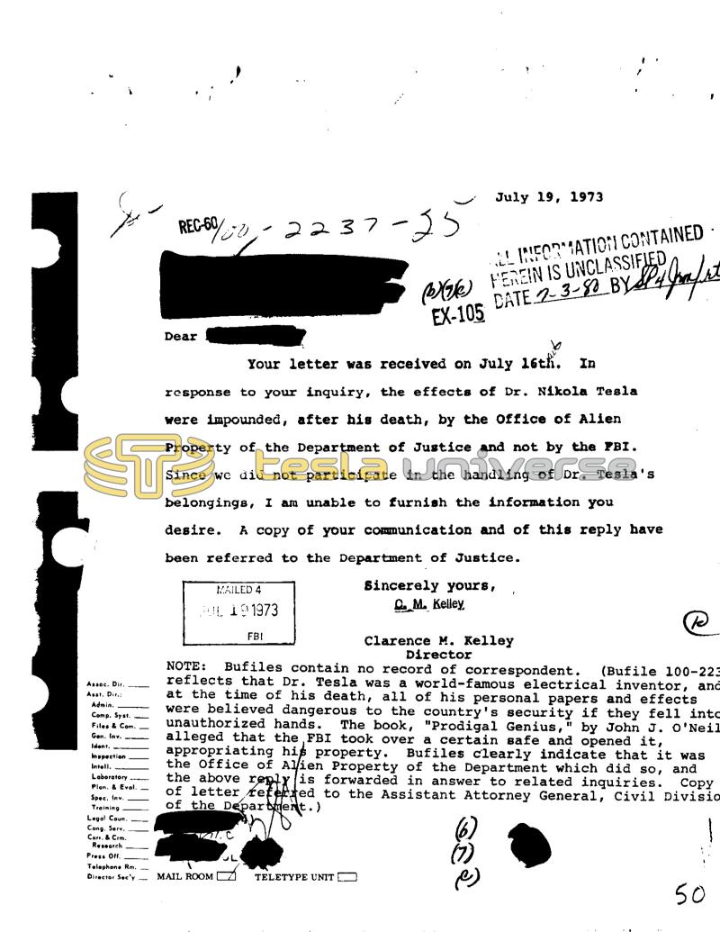Assoc. Dir. Asst. Dir.: Admin. Comp. Syst. Files & Com. Gen. Inv. Ident. Inspection Intell. Laboratory Plan. & Evol. Spec. Inv. Training Legal Coun. Cong. Serv. Corr. & Crm. Research Press Off. Telephone Rm, Director Sec'y REC-80/50-2237-25 Dear MAILED 4 JUL 191973 Your letter was received on July 16th. In response to your inquiry, the effects of Dr. Nikola Tesla were impounded, after his death, by the Office of Alien Property of the Department of Justice and not by the FBI. Since we did not participate in the handling of Dr. Tesla's belongings, I am unable to furnish the information you desire. A copy of your communication and of this reply have been referred to the Department of Justice. T217/C MAIL ROOM pore EX-105 FBI July 19, 1973 TELETYPE UNIT Ⓡ NOTE: Bufiles contain no record of correspondent. (Bufile 100-223 reflects that Dr. Tesla was a world-famous electrical inventor, and at the time of his death, all of his personal papers and effects were believed dangerous to the country's security if they fell into unauthorized hands. The book, "Prodigal Genius, by John J. O'Neil alleged that the FBI took over a certain safe and opened it, appropriating his property. Bufiles clearly indicate that it was the Office of Alien Property of the Department which did so, and the above reply is forwarded in answer to related inquiries. of letter feferred to the Assistant Attorney General, Civil Divisio of the Department.) Copy 1 8 AL INFORMATION CONTAINED - HEREIN IS UNCLASSIFIED CATE -2-3-82 BY Sincerely yours, Q.M. Kelley 1 Clarence M. Kelley Director 50