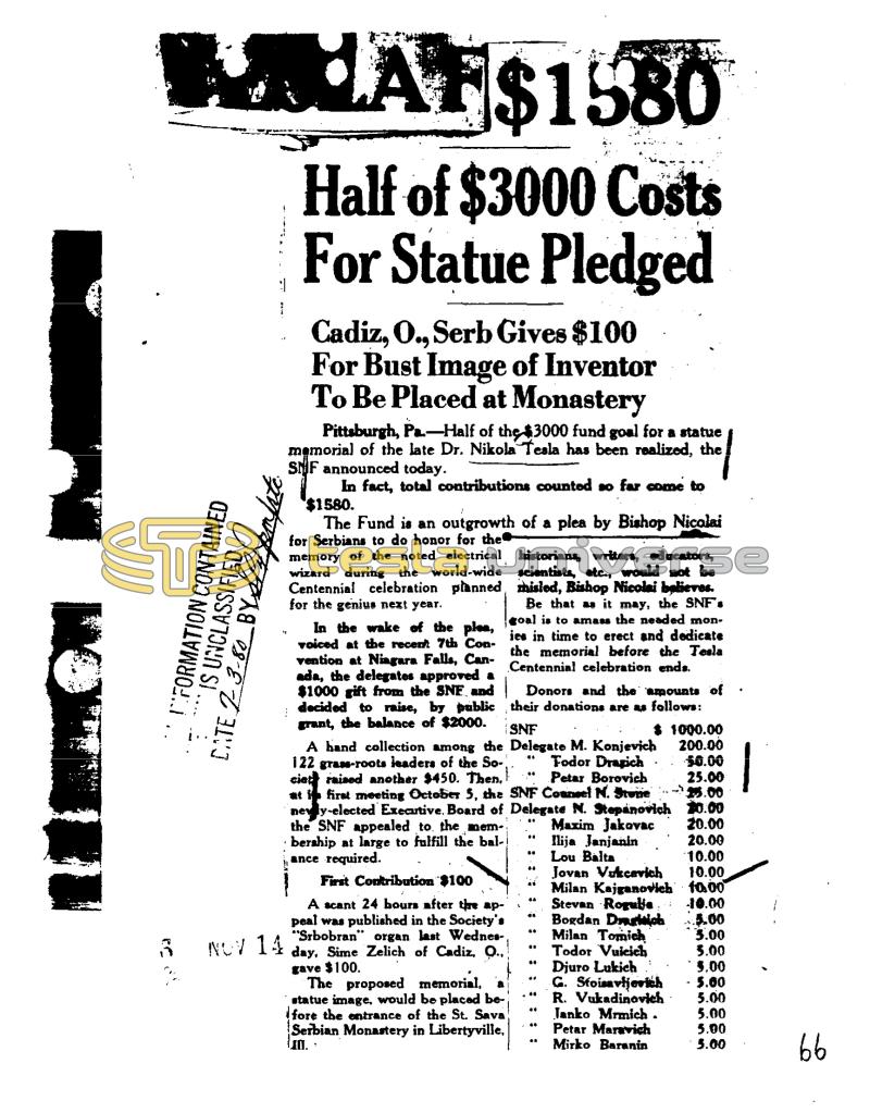 : BALAF$1580 Half of $3000 Costs For Statue Pledged er e 3 I FORMATION CONTAINED EIS UNCLASSIFIED CATE. Cadiz, O., Serb Gives $100 For Bust Image of Inventor To Be Placed at Monastery Pittsburgh, Pa.-Half of the $3000 fund goal for a statue memorial of the late Dr. Nikola Tesla has been realized, the SNF announced today. In fact, total contributions counted so far come to $1580. The Fund is an outgrowth of a plea by Bishop Nicolai for Serbians to do honor for the memory of the noted electrical wizard during the world-wide Centennial celebration planned, for the genius next year. historians, writers, educators, scientists, etc., would not be misled, Bishop Nicolai believes. Be that as it may, the SNF'. goal is to amass the neaded monIn the wake of the plea, ies in time to erect and dedicate the memorial before the Tesla Centennial celebration ends. voiced at the recent 7th Convention at Niagara Falls, Canada, the delegates approved a $1000 gift from the SNF and decided to raise, by public grant, the balance of $2000. Donors and the amounts of their donations are as follows: ¡SNF $ 1000.00 200.00 50.00 25.00 25.00 20.00 20.00 20.00 10.00 10.00 f0.00 -10.00 A hand collection among the Delegate M. Konjevich 122 grass-roots leaders of the Societ raised another $450. Then, Fodor Drapich Petar Borovich at is first meeting October 5, the SNF Counsel N. Stene newly-elected Executive Board of Delegate N. Stepanovich the SNF appealed to the membership at large to fulfill the balance required. Maxim Jakovac Ilija Janjanin Lou Balta First Contribution $100 A scant 24 hours after the appeal was published in the Society's "Srbobran" organ last WednesNOV 14 day. Sime Zelich of Cadiz, 9.. gave $100. The proposed memorial, statue image, would be placed before the entrance of the St. Sava Serbian Monastery in Libertyville, LIN. • ** 50 40 ●● Jovan Vukcevich Milan Kajganovich Stevan Rogulje Bogdan Dragich Milan Tomich Todor Vuicich Djuro Lukich G. Stoisavljevich R. Vukadinovich Janko Mrmich. Petar Maravich Mirko Baranin 5.00 3.00 3.00 3,00 5.00 5.00 5.00 5.00 5.00 66