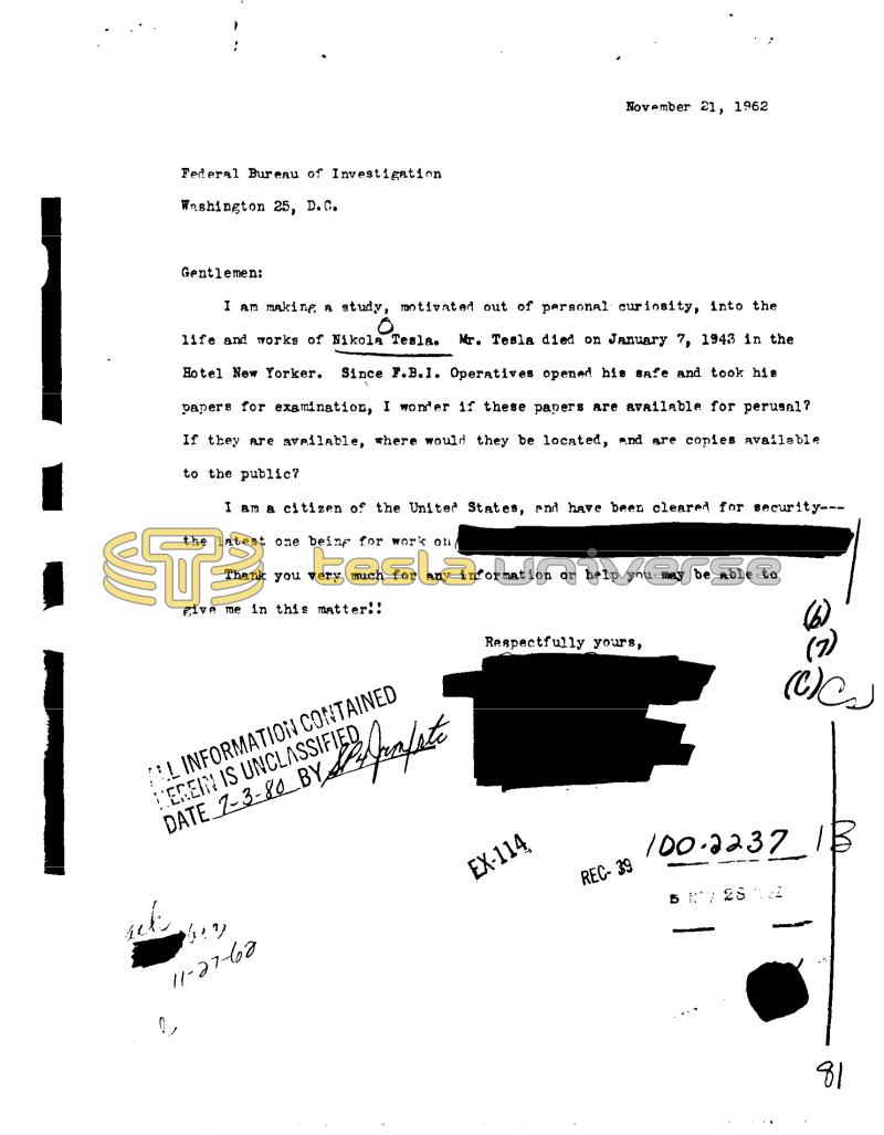 Federal Bureau of Investigation Washington 25, D.C. ack Gentlemen: I am making a study, motivated out of personal curiosity, into the O life and works of Nikola Tesla. Mr. Tesla died on January 7, 1943 in the " Hotel New Yorker. Since F.B.I. Operatives opened his safe and took his papers for examination, I wonder if these papers are available for perusal? If they are available, where would they be located, and are copies available to the public? I am a citizen of the United States, and have been cleared for security-- the latest one being for work on, Thank you very much for any information or help you may be able to give me in this matter!! ALL INFORMATION CONTAINED VEREIN IS UNCLASSIFIED DATE 7-3-80 BY prapate bio 11-27-62 November 21, 1962 Respectfully yours, EX-114 REC-39 (7) 100.2237 1B 5 NV 23 81