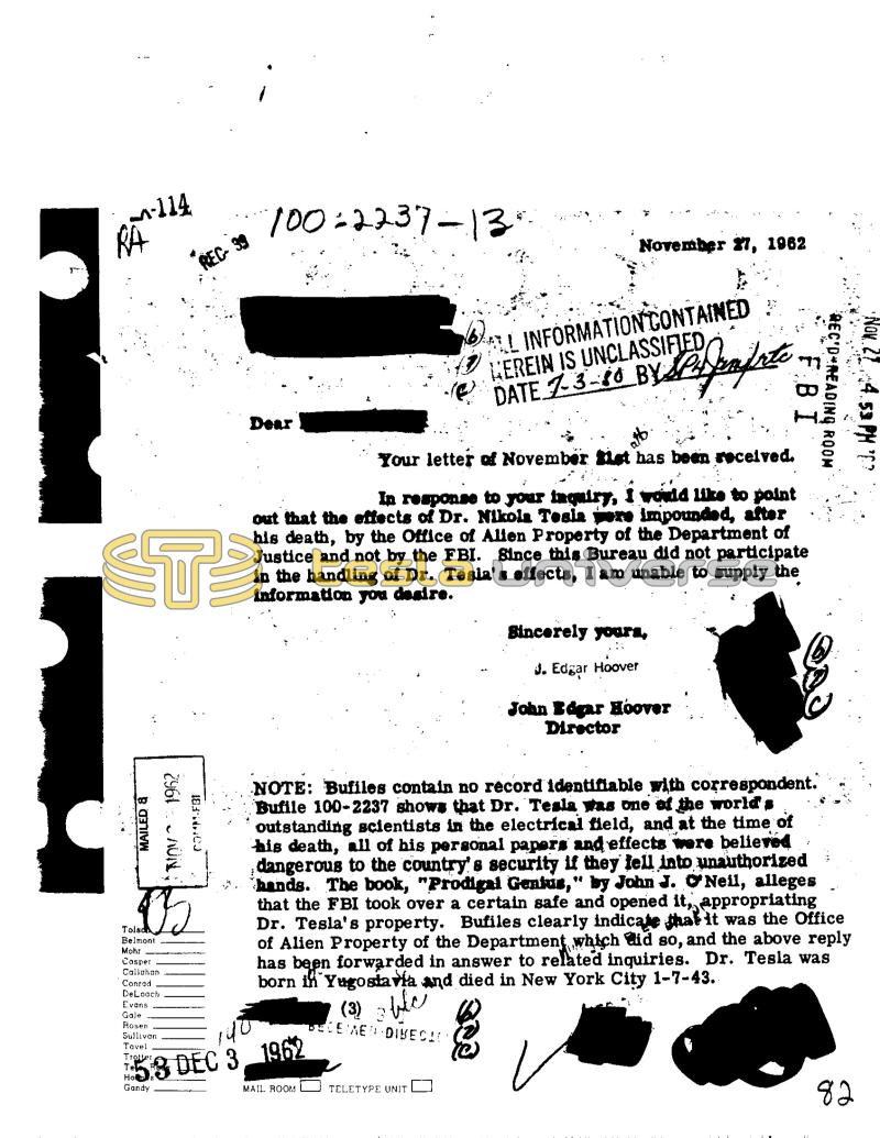 -114 RA MAILED & 2961 AUN. REC39 COMM-FBI 100-2237-13° Dear Tolsd Belmont Mohr Casper Callahan Conrad DeLoach Evans Gale Rosen Sullivan Tavel Trotter Te 5.3 DEC 3 1962 Gandy MAIL ROOM ·(e) Your letter of November 1st has been received. atto In response to your inquiry, I would like to point out that the effects of Dr. Nikola Tesla ere impounded, after his death, by the Office of Allen Property of the Department of Justice and not by the FBI. Since this Bureau did not participate in the handling of Dr. Tesia's effects, I am unable to supply the information you desire. (3) bic DECEMMEN DIVECH November 27, 1962 4 ALL INFORMATION CONTAINED HEREIN IS UNCLASSIFIED DATE 7-3-10 BY SPipiste TELETYPE UNIT NOTE: Bufiles contain no record identifiable with correspondent. Bufile 100-2237 shows that Dr. Tesla was one of the world's outstanding scientists in the electrical field, and at the time of his death, all of his personal papers and effects were believed dangerous to the country's security if they fell into unauthorized hands. The book, "Prodigal Genius," by John J. O'Neil, alleges that the FBI took over a certain safe and opened it, appropriating Dr. Tesla's property. Bufiles clearly indicate that it was the Office of Alien Property of the Department which did so, and the above reply has been forwarded in answer to related inquiries. Dr. Tesla was born in Yugoslavia and died in New York City 1-7-43. ICO Sincerely yours, J. Edgar Hoover FBI REC'D READING ROOM John Edgar Hoover Director 2 82 Nov 27 44.53 PM f?