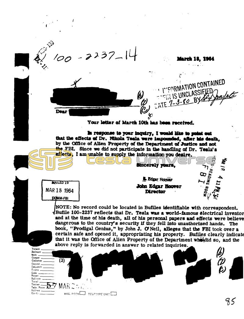 Tolson Belmont I-3.113 Mohr Casper Callahan Conrad DeLoach Evans Gale Rosen Sullivan Tavel 100-2237-14 Dear MAILED 19 MAR 18 1964 COMM-FBI Your letter of March 10th has been received. In response to your inquiry, I would like to paint out that the effects of Dr. Nikola Tesla were impounded, after his death, by the Office of Allen Property of the Department of Justice and not the FBI. Since we did not participate in the handling of Dr. Tesla's effects, I am unable to supply the information you desire. Sincerely yours, (3) Trotter Tole Room 5.7 MAR 2015. BER Holmes Gandy (6) MAIL ROOMI March 18, 1964 TELFTYPE UNIT INFORMATION CONTAINED IS UNCLASSIFIED CATE 7-3-80 BYS's papete NOTE: No record could be located in Bufiles identifiable with correspondent. Bufile 100-2237 reflects that Dr. Tesla was a world-famous electrical inventor and at the time of his death, all of his personal papers and effects were believedangerous to the country's security if they fell into unauthorized hands. The book, "Prodigal Genius," by John J. ONeil, alleges that the FBI took over a certain safe and opened it, appropriating his property. Bufiles clearly indicate that it was the Office of Alien Property of the Department whildid so, and the above reply is forwarded in answer to related inquiries. Edgar Hoover John Edgar Hoover Director FBI RECO-READING ROOM MAR IR 4 11 PH (2) © 85