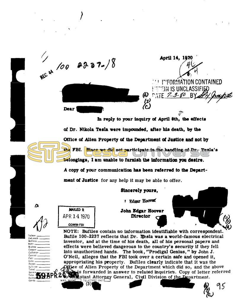 12 Tolson DeLoach Walters Mohr REC 44 Bishop Casper Callahan Conrad Felt Gale Rosen Sullivan Tave: Soyars Tele. Gandy 100 2237-18 Dear MAILED 9 APR 14 1970 (60 8 April 14, 1970 CACK 46 59 APR 2600 MAIL ROOM "FORMATION CONTAINED HEREIN IS UNCLASSIFIED 2-3-80 PATE 7.3.80 BY Hof Grapte In reply to your inquiry of April 8th, the effects of Dr. Nikola Tesla were impounded, after his death, by the Office of Alien Property of the Department of Justice and not by the FBI. Since we did not participate in the handling of Dr. Tesla's belongings, I am unable to furnish the information you desire. A copy of your communication has been referred to the Department of Justice for any help it may be able to offer. Sincerely yours, 1 Edgar Hoover. John Edgar Hoover Director alo COMM-FBI NOTE: Bufiles contain no information identifiable with correspondent. Bufile 100-2237 reflects that Dr. Hesla was a world-famous electrical inventor, and at the time of his death, all of his personal papers and effects were believed dangerous to the country's security if they fell into unauthorized hands. The book, "Prodigal Genius, " by John J. O'Neil, alleges that the FBI took over a certain safe and opened it, appropriating his property. Bufiles clearly indicate that it was the Office of Alien Property of the Department which did so, and the above is forwarded in answer to related inquiries. Copy of letter referred istant Attorney General, Civil Division of the Department. TELETYPE UNITI (3) 晨 95 qive