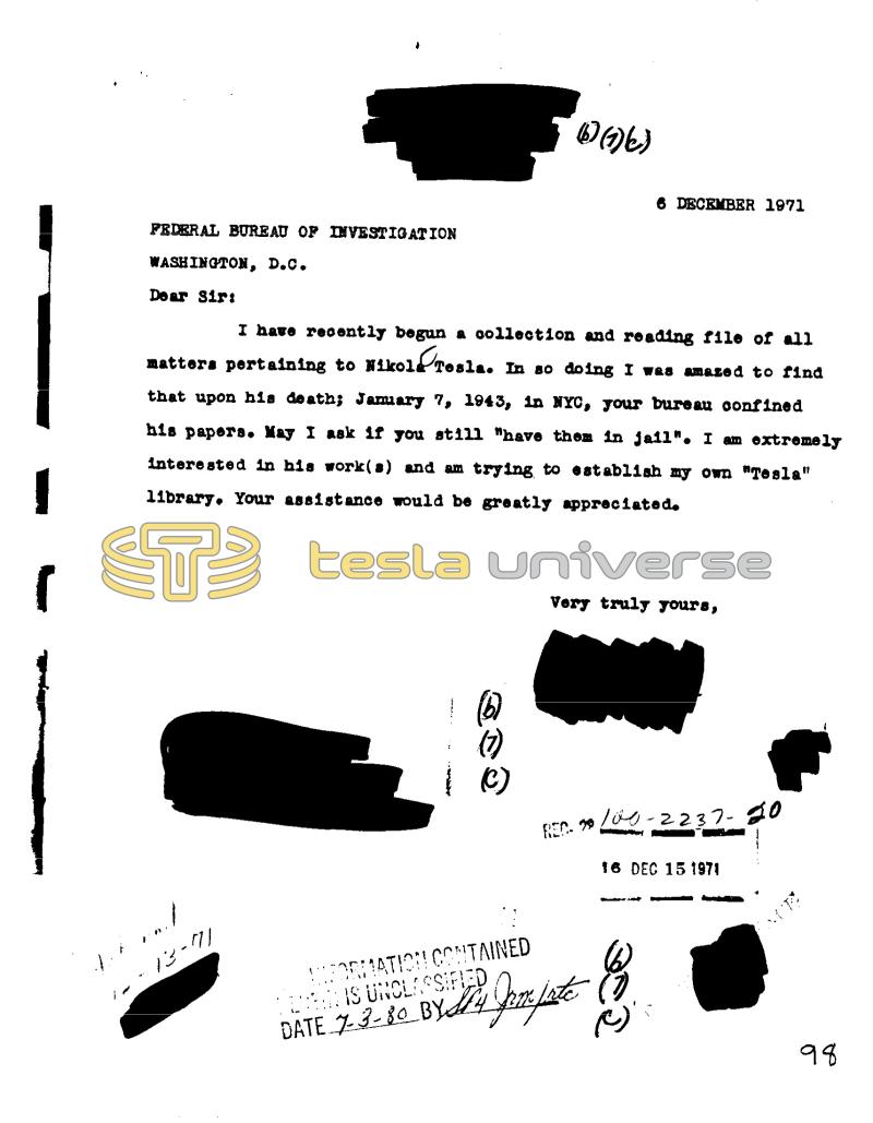 FEDERAL BUREAU OF INVESTIGATION WASHINGTON, D.C. Dear Sir: di rut I have recently begun a collection and reading file of all matters pertaining to Nikole Tesla. In so doing I was amazed to find that upon his death; January 7, 1943, in NYC, your bureau confined his papers. May I ask if you still "have them in jail". I am extremely interested in his work(s) and am trying to establish my own "Tesla" library. Your assistance would be greatly appreciated. 13-71 (17) (C) (1)(1)(6) FORMATION CONTAINED EN IS UNCLASSIFIED BY S4 DATE 7-3-80 BY 4 6 DECEMBER 1971 Very truly yours, REC. 29 proposte Co () 100-2237-20 16 DEC 15 1971 98