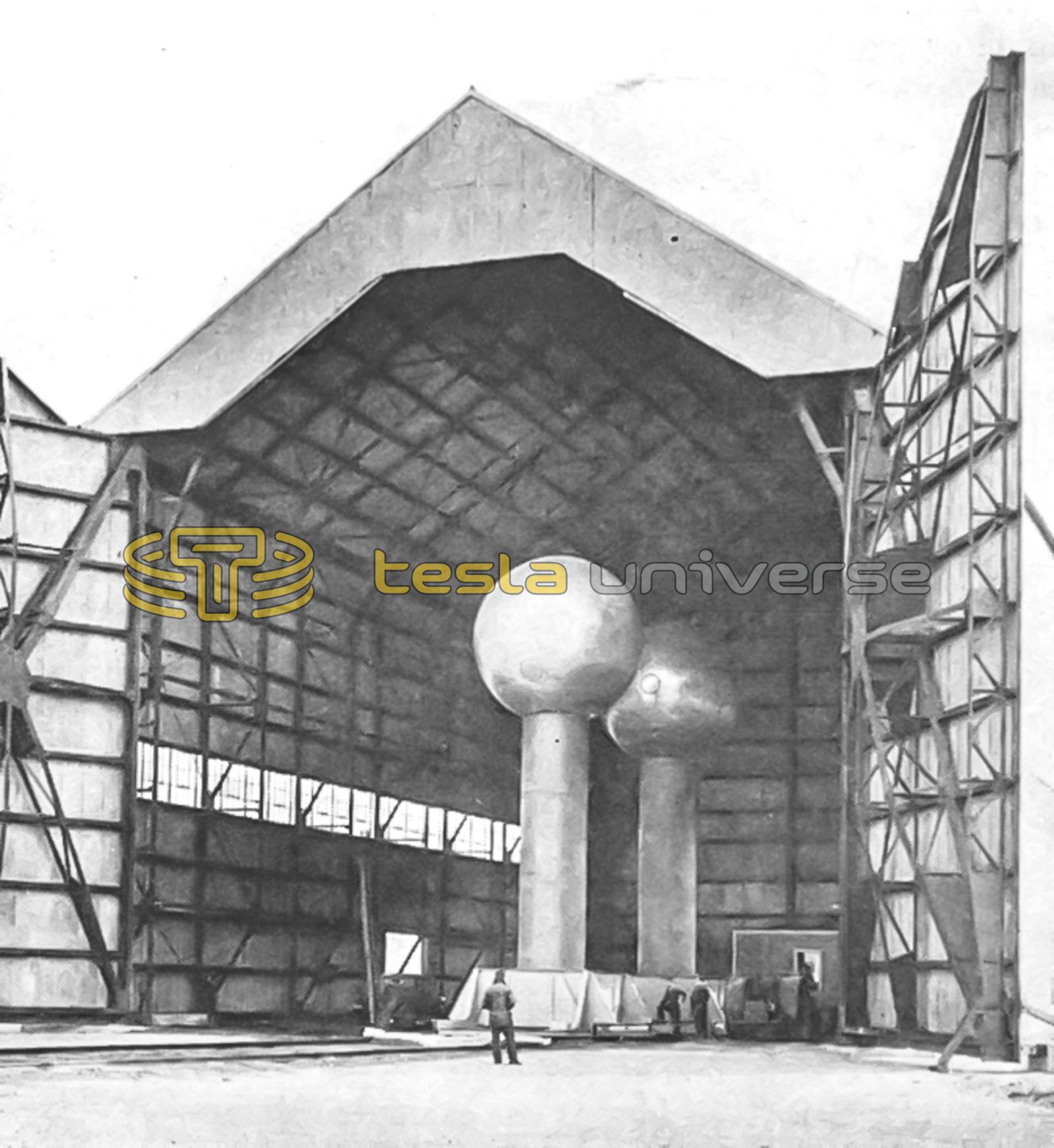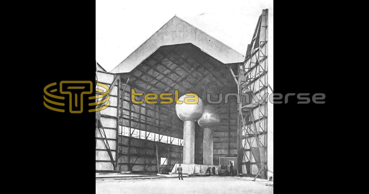 The Van de Graaff generator, shown housed in an aircraft hangar, is discussed by Dr. Tesla in the accompanying article.