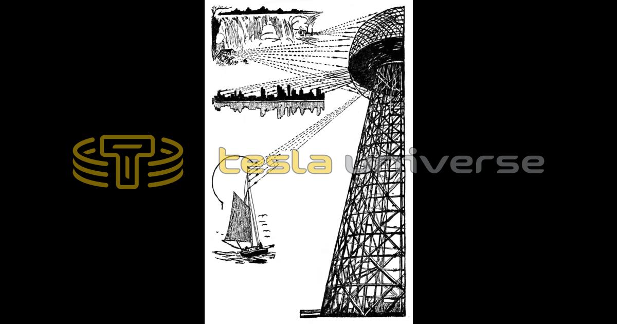 Illustration showing Wardenclyffe tower sending and receiving electricity