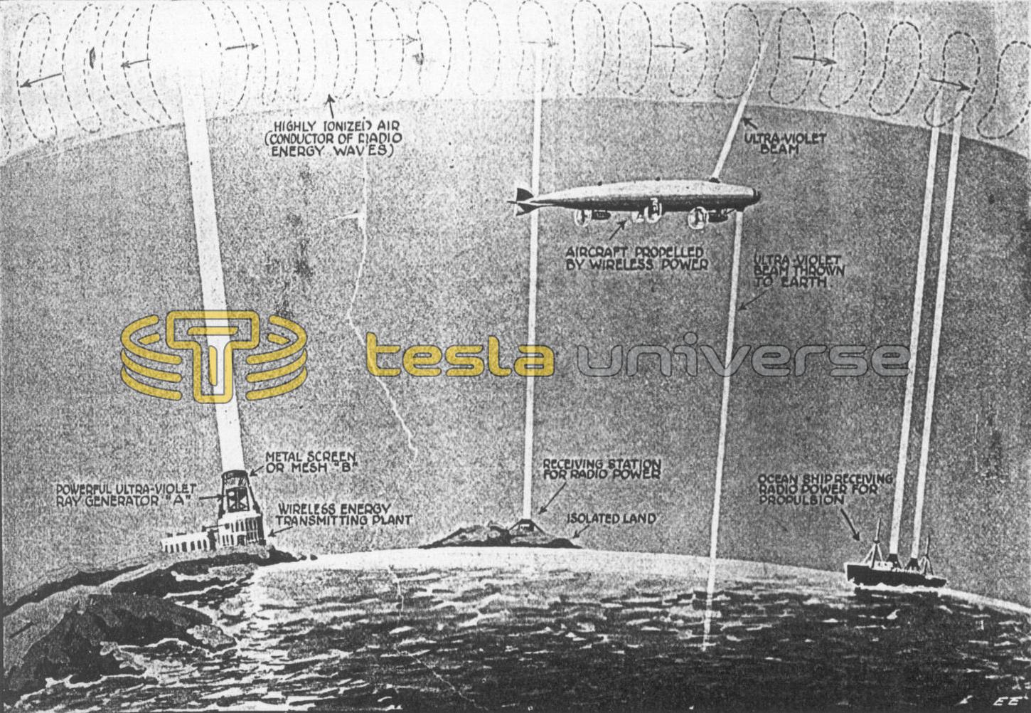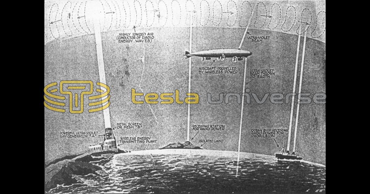 Showing the wireless transmission of power by means of ionized searchlight beams. Powerful Tesla currents of high potential and