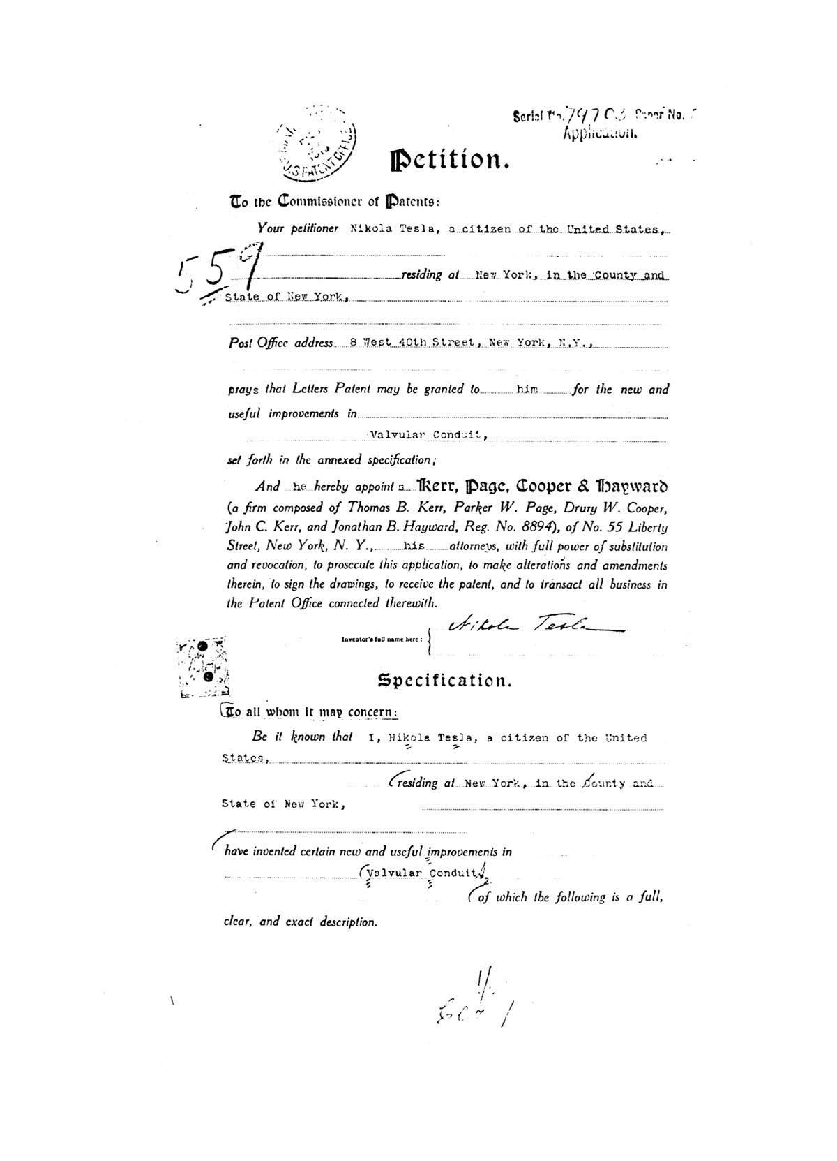 Nikola Tesla Patents Tesla was granted nearly 200 patents worldwide Nikola Tesla U.S. Patent 1,329,559 - Valvular Conduit Patent Wrapper Page 3 Pagination First page First item Previous page Previous item Next page Next item Last page Last item Within the Universe Documents Nikola Tesla documents, files and papers. Quotes Profound and insightful quotes by Nikola Tesla. Books Books written by and about Nikola Tesla. Timeline Important moments and events related to Tesla. Articles Nikola Tesla in the press. Images Nikola Tesla image and photo library. Landmarks Locations related to Nikola Tesla. Letters Letters to, from and about Nikola Tesla. Movies and TV Nikola Tesla on the screen.